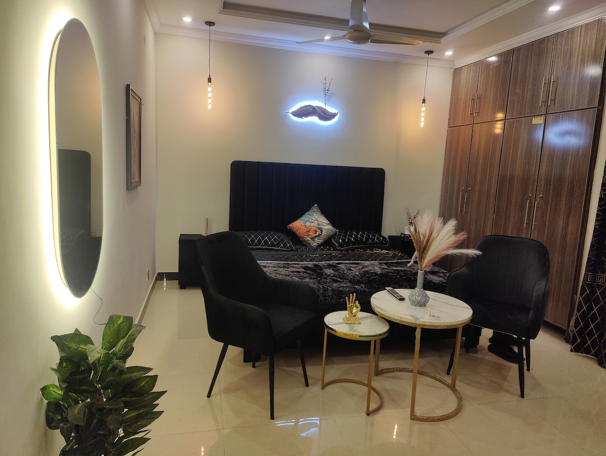 🍀 Насолоджуйтеся сучасною шикарною квартирою-студією в Джохар Таун Фаза 1, зручно розташованою поруч з лікарнею Джинна. Це стильне помешкання ідеально підходить для пар, друзів, бізнес-мандрівників і медичних відвідувачів, які шукають чисте та комфортне помешкання. 📍Розташоване в безпечній і тихій будівлі з легким доступом до ресторанів, ринків і головних доріг, воно поєднує в собі стиль, комфорт і зручність. 🟢 Доступно для пар, сімей, мандрівників і друзів