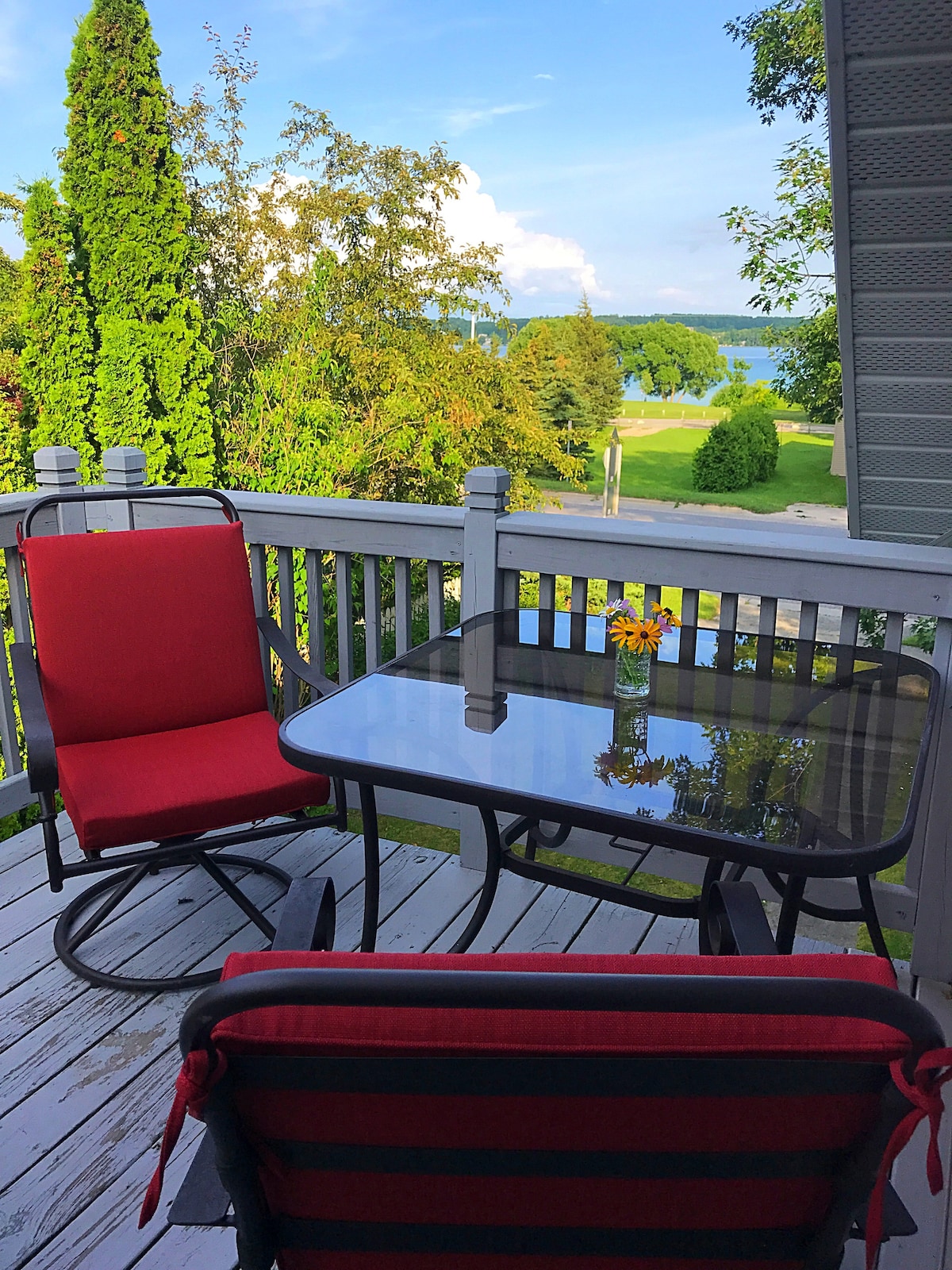 Насолоджуйтеся чотирма сезонами краси в приватному гостьовому люксі на першому поверсі зі спальнею, вітальнею, ванною кімнатою та їдальнею/сніданком із Keurig, мікрохвильовою піччю та невеликим холодильником (без кухні). Вийдіть за двері до озера, де можна відпочити на сонці, скористатися байдарками та розвести вогонь. Розташований за 3 милі від Академії мистецтв Інтерлохенів, легко дістатися до Траверс-Сіті, дюн «Сплячий ведмідь», «Кришталева гора», велосипедні прогулянки, пішохідні та бігові стежки, а також нагороджені нагородами поля для гольфу та диск-гольфу.