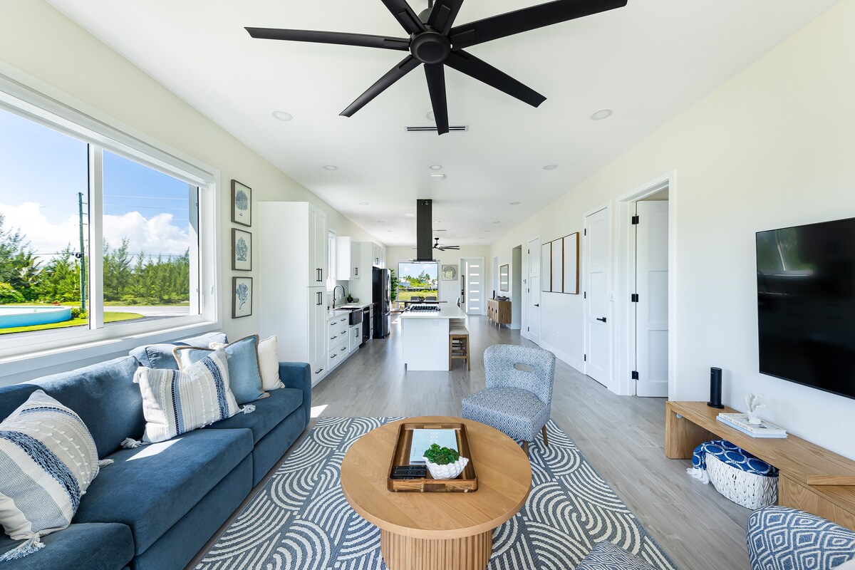 Blue Wave Dreamin’ Ocean Villa 920 is a bright & airy 2 bdrm/2 bth villa, built & furnished in Jan 2023, floor to ceiling windows & sliding glass doors surround the open concept kitchen & living area, on the swimming pool & green area, 40 yards from beach, adjacent to the Marina. Decorated in blues & greens of Bahamian waters & grey tones of driftwood. In the boutique community of Ocean Villas situated on Treasure Cay beach ranked by National Geographic in the Top 10 beaches in the World.