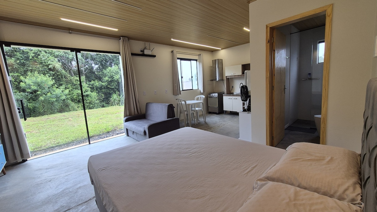 Apartamento novo 01 Quarto com cama casal. Possui fogão, geladeria, chaleira elétrica e microondas. Localização privilegiada, com fácil acesso na entrada da cidade. Está a 3 km do centro e da proximo da Havan, supermercados e e de todo complexo veicular da cidade, como concessionárias, mecanicas, lojas de veículos. Bairro residencial muito calmo e seguro.