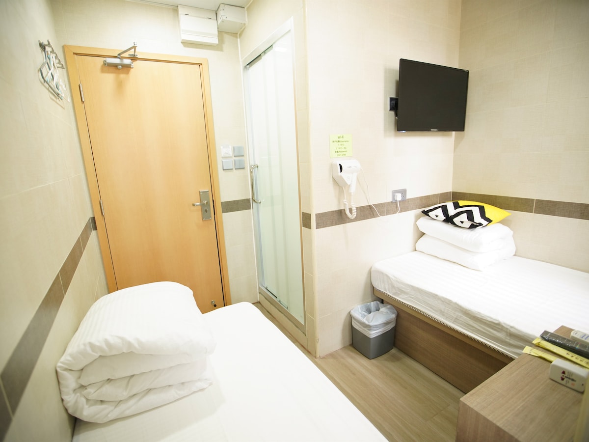 Це затишна та комфортна кімната, в якій можуть розміститися дві людини. Кімната обладнана двома односпальними ліжками та робочим столом. Є велике вікно, яке пропускає багато природного освітлення. Ванна кімната обладнана душовою кабіною, туалетом. Ця кімната ідеально підходить для двох друзів або братів і сестер, які подорожують разом, які хотіли б мати доступне приватне помешкання.Чудове розташування, легкий доступ до популярних магазинів і ресторанів.
