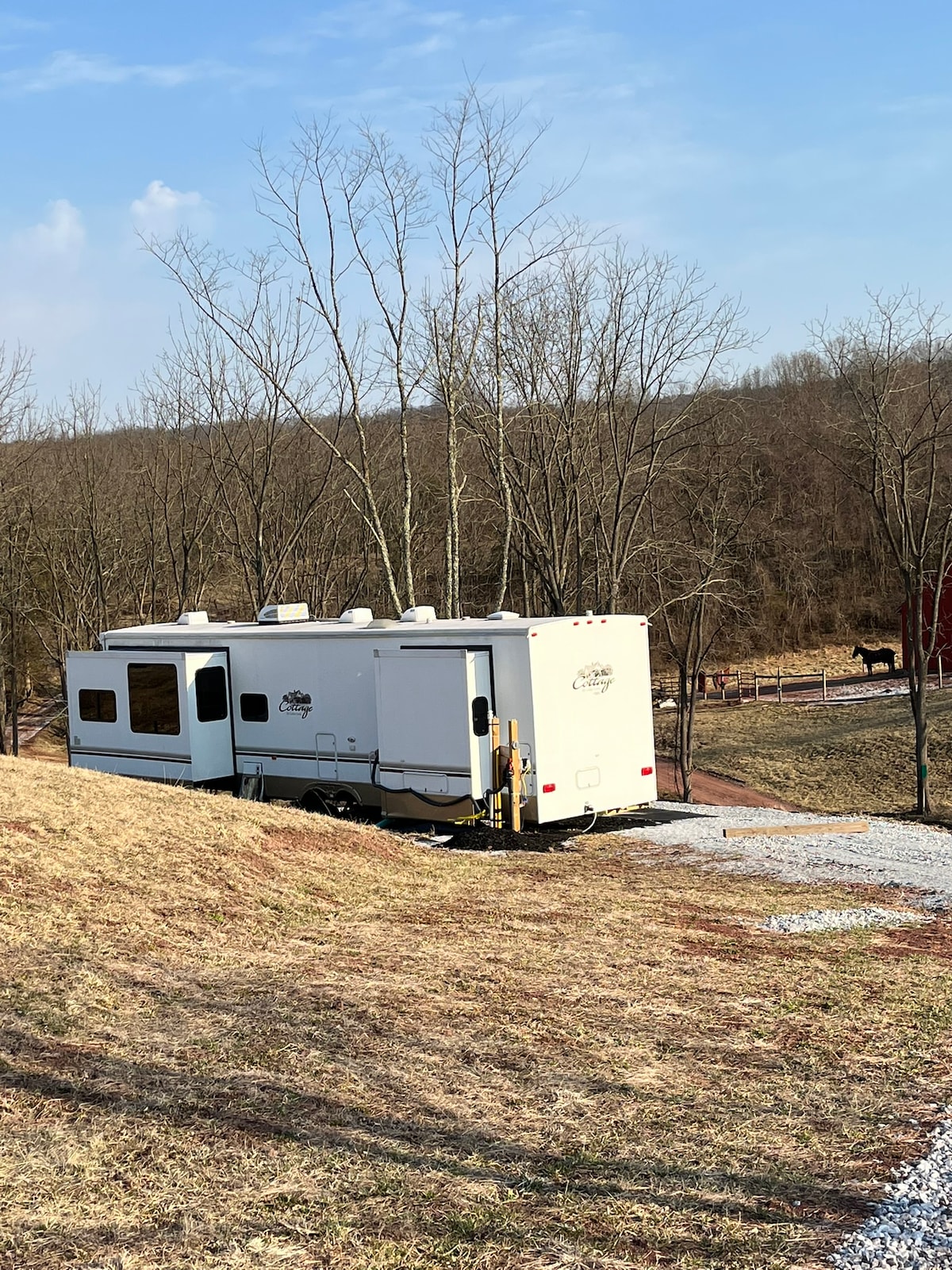 Насолоджуйтеся тихим шепотом коней, звуками природи, дивлячись у вікна, щоб побачити коней просто за вашим кемпером, коли ви перебуваєте в цьому унікальному просторі. Розташована на нашій історичній конній фермі площею 19 акрів, поруч із головним історичним сараєм, побудованим у 1809 році. У вас є всі радощі кемпінгу, поряд з конями та їхніми загонами. Насолоджуйтеся катанням на конях по мальовничих лісових стежках (за додаткову плату), відпочивайте за зовнішнім столиком, спостерігаючи за нашими конями, або розслабляйтеся у своєму автофургоні та дивіться фільми.