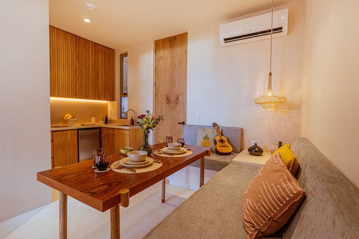 Feel right at home and enjoy all the comforts you expect. This apartment features one bedroom with a bathroom, a fully equipped kitchen, a living room that opens onto a balcony with a private jacuzzi surrounded by lush greenery. Located in a new building with only six units, it also offers a lounge area, terrace, pergola, and shared pool. Just steps away from a lively neighborhood full of great dining options . FREE BIKES to explore Tulum