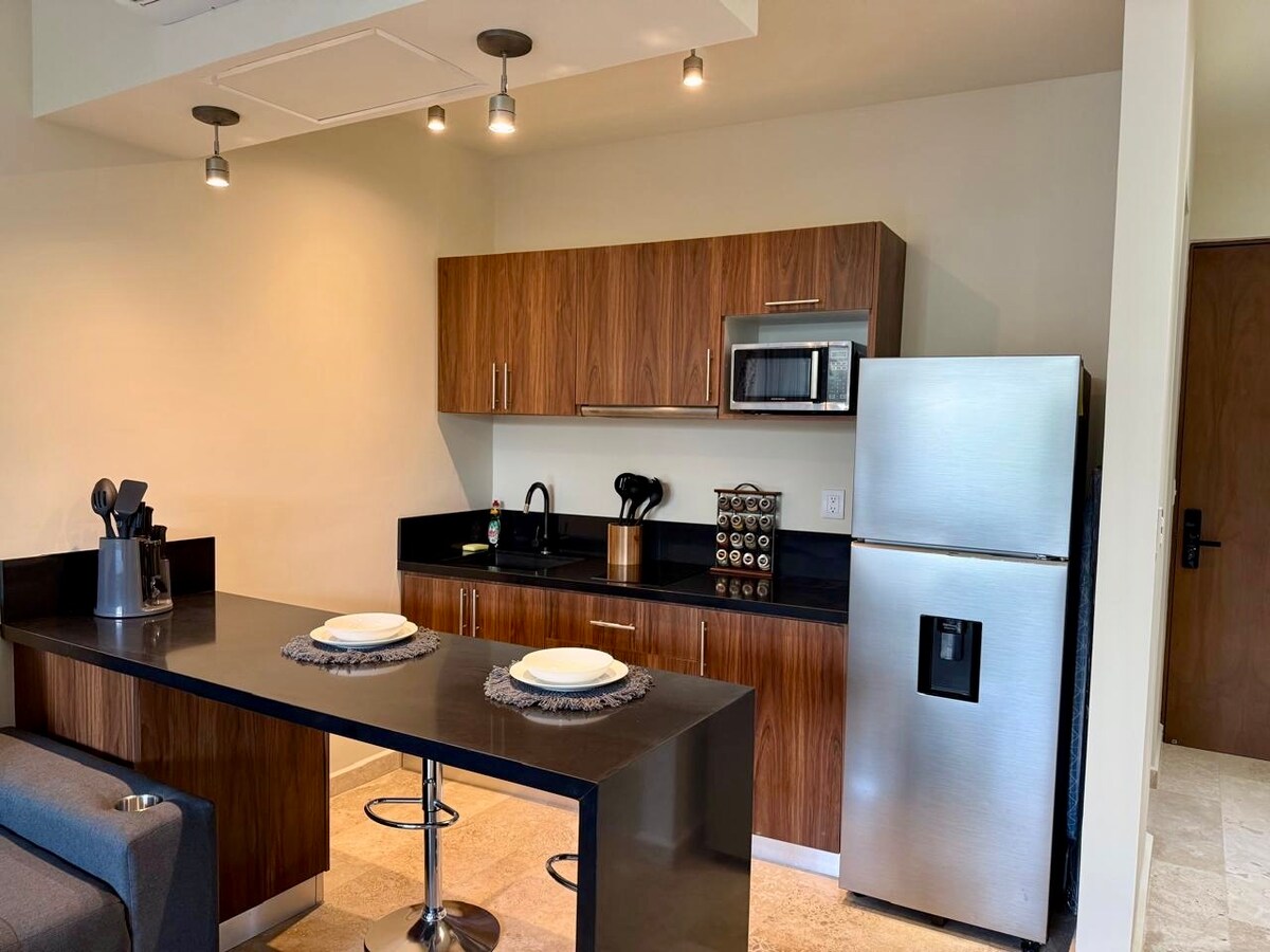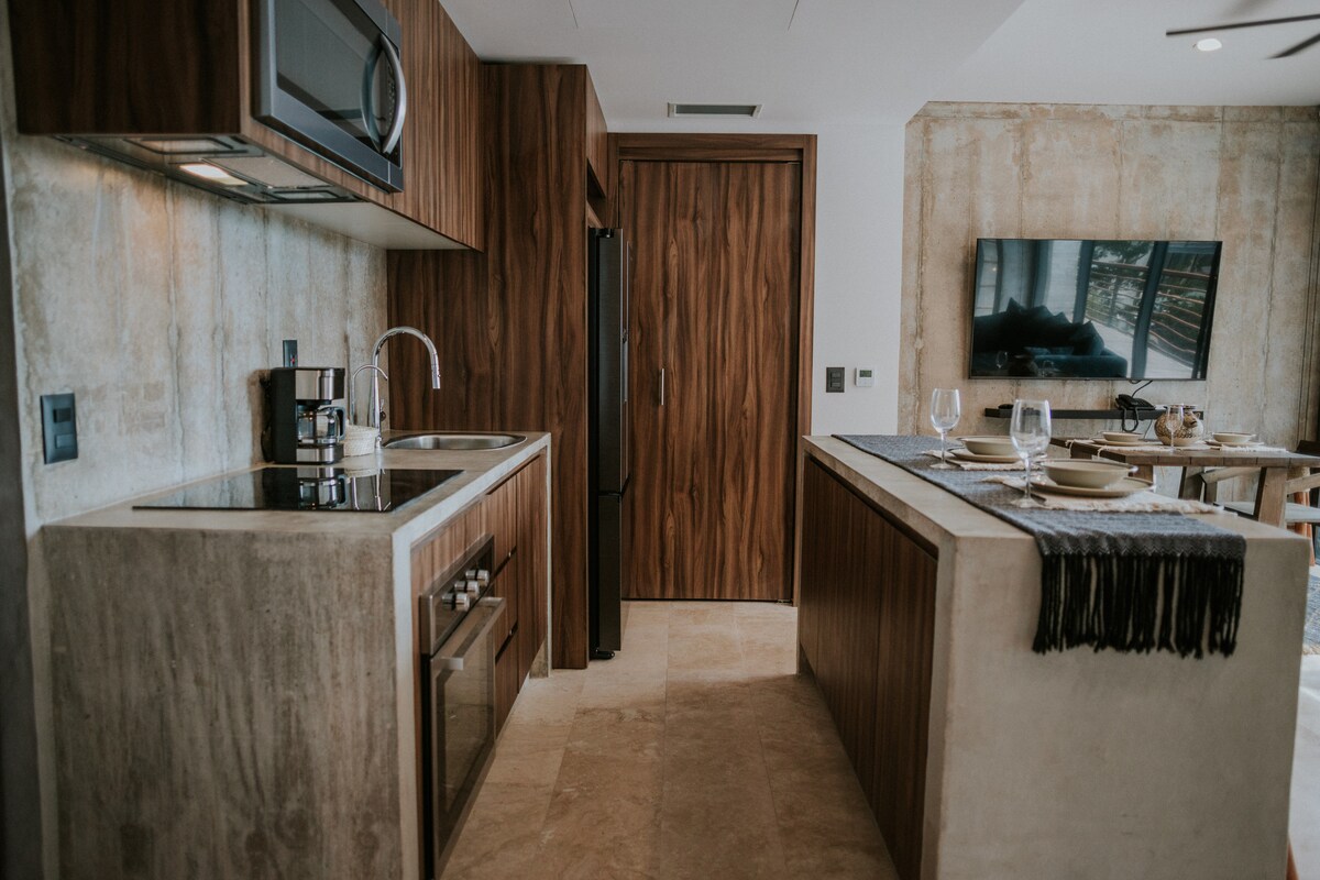 Приголомшлива квартира-лофт з прямим доступом до басейнів, поблизу центру Тулума та лише за декілька хвилин від вражаючого пляжу та пляжних клубів Тулума. Насолоджуйтеся кількома приголомшливими басейнами, басейном на даху, шезлонгами, гарним тренажерним залом, персоналом 24/7, сильним кондиціонером, ліфтом, швидким Wi-Fi (400 Мбіт/с), затемнювальними шторами, 55-дюймовим смарт-телевізором, повністю обладнаною кухнею та приватною парковкою. Посмакуйте обідом на відкритому повітрі або просто випийте улюблені напої, насолоджуючись панорамним краєвидом із ресторану на даху