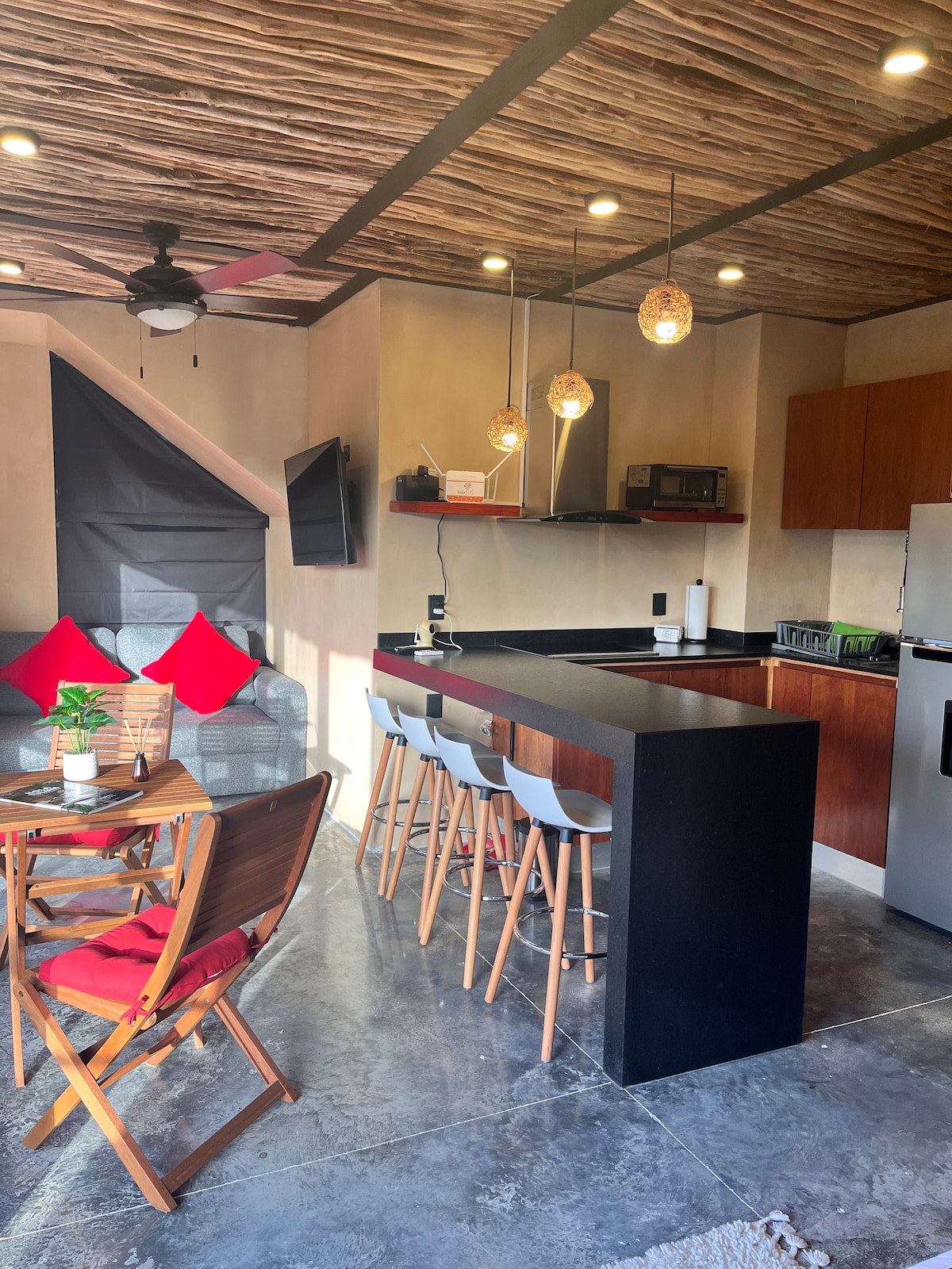 Seky Loft, великий простір, комфорт і максимальна конфіденційність. Вийдіть із рутини та зануртеся в дивовижне враження від цього відкритого планування та комфортного лофту. Зовні це затишний будинок, зсередини - унікальний простір, повний художніх виразів і комфорту. Джакузі на балконі - це смачна і дуже приватна деталь, якою можна насолодитися. Перед кожним прибуттям вілла повністю дезінфікується, що забезпечує гігієну та знищення будь-якого мікроорганізму, включаючи Covid-19. Лофт великої амплітуди, де кожна зона визначається своєю функціональністю, декором, кольорами, меблями і дизайнерськими аксесуарами. З дуже високою стелею ручної роботи в карибському стилі, великими вікнами, і в той же час абсолютною приватністю. Усі зони призначені лише для гостей У нас є персоналізований сервіс для реєстрації, а також безпека та увага 24 години на добу. Він розташований в самому серці Тулума, в оточенні справжнього аромату мексиканського села. Район дуже тихий і легкодоступний. В декількох кроках знаходяться невеликі ресторани і навіть аптека і магазин OXXO. Безпека та цілодобова допомога. Крім 200 метрів ви знайдете модну вулицю в центрі Тулума, з різними ресторанами, барами, магазинами і всіма видами послуг. Миттєвий доступ до таксі (дуже дешево) і прокат велосипедів. Перед лофтом ви можете припаркувати свій автомобіль. Ми пропонуємо послуги трансферу з аеропорту - лофт, прокат велосипедів, прокат автомобілів, домашній шеф-кухар і масаж. Ми приймаємо дрібних домашніх тварин, під відповідальність гостя