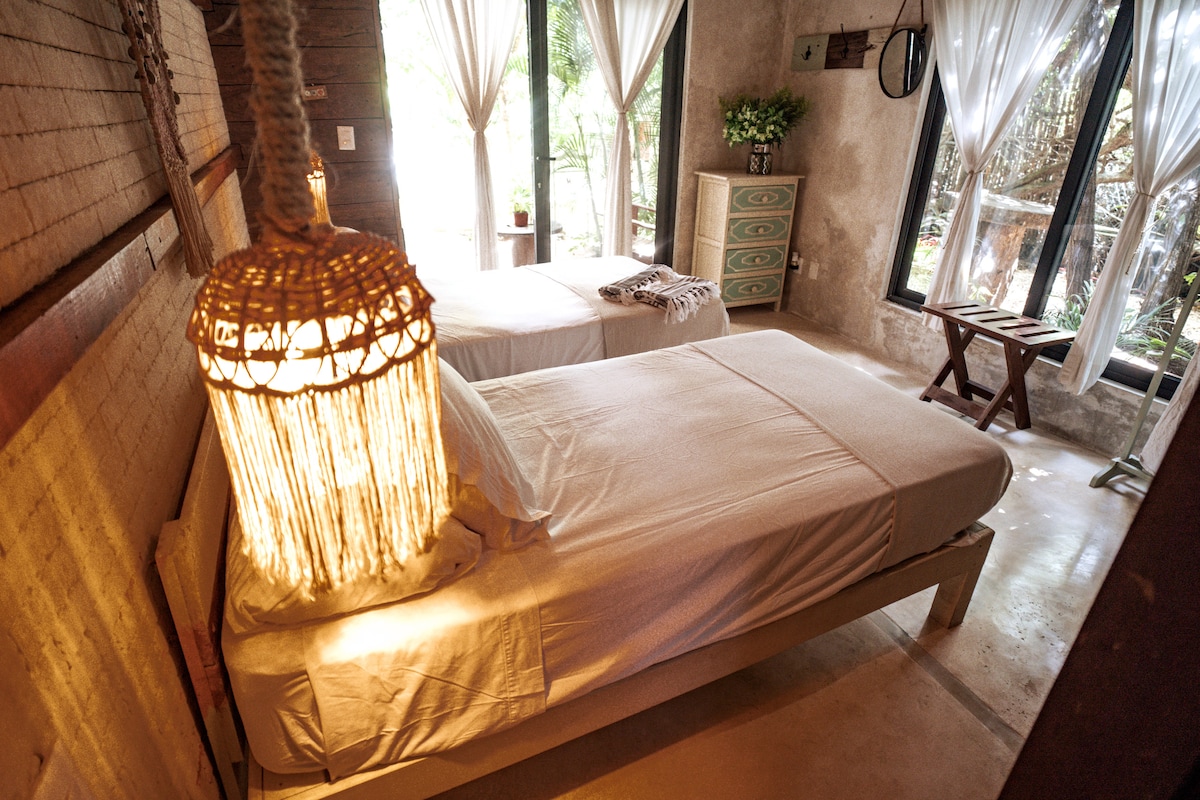 ONLY 2 MINUTES WALK FROM THE BEACH! King size bed, cotton sheets, air conditioning.... Charming room nestled in the jungle, facing the most fabulous white sand beach and the sea. Our guests enjoy access to the beach just across the street! The sunset views are amazing from our rooftop. 20% discount when booking 7 nights, no cleaning fees, no extra $