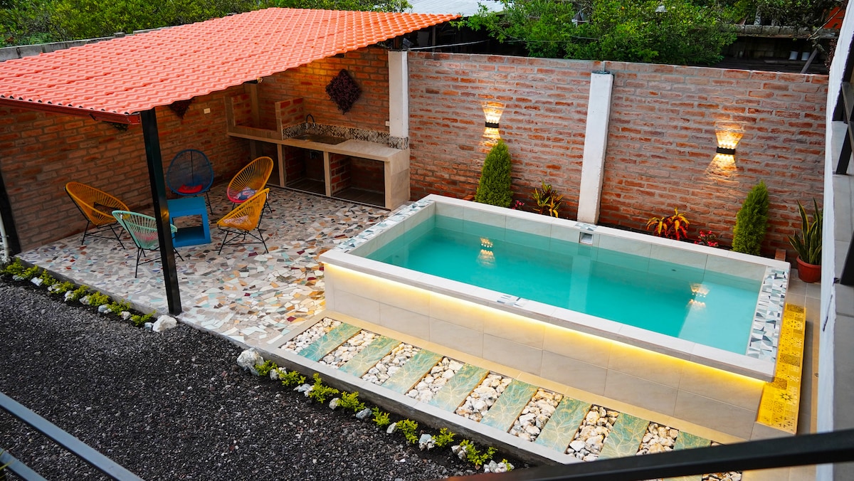 Relájate con toda la familia en este tranquilo lugar para ospedarce, contamos con piscina de agua caliente, cocina, sala, comedor, 3 baños, cuarto principal con una cama de 2 plazas y media , 5 habitaciones con 2 camas cada una de 2 plazas y media, temenos area de azado y area de fogata.