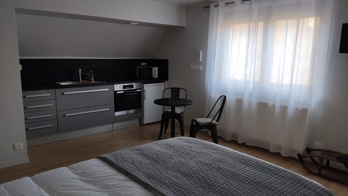 Гарна студія, ідеально обладнана, неподалік від ресторанів, неподалік від великої парковки. Оснащення: нове ліжко 1,40 м x 1,90 м, подвійна раковина, 2 індукційні варильні поверхні, обертова духовка Seb, мікрохвильова піч, холодильник, пральна машина Vedette, телевізор, Wi-Fi у помешканні (коробку не можна вимикати) Оренда за ніч: 38 євро Оренда за тиждень: 260 євро Пов’язано з туристичним бюро Кольмара та Тюркхайма.