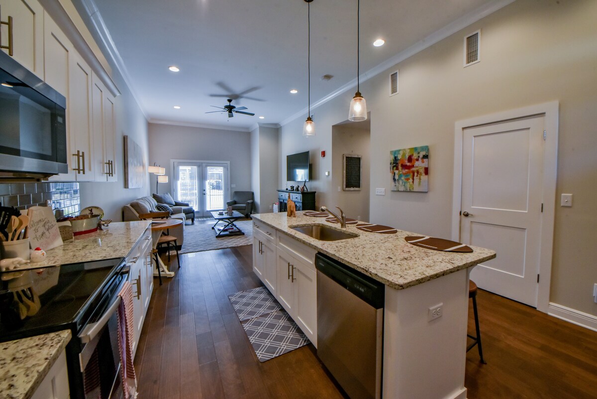 Ласкаво просимо до нашої красивої дуже простої квартири з 2 спальнями, 2 ванними кімнатами та диваном-ліжком queen size в центрі міста Таскалуса. Ця красива квартира пропонує дуже простору кухню та вітальню зі стелями висотою 11 футів. Насолоджуйтеся повністю обладнаною кухнею, закритою парковкою, пральною/сушильною машиною, оптоволоконним Інтернетом, смарт-телевізорами та тренажерним залом. Це чудове розташування знаходиться в 2 кварталах від кількох ресторанів, барів, магазинів, амфітеатру Тускалузи, а також в декількох хвилинах ходьби від вулиці та кампусу Університету Алабами.