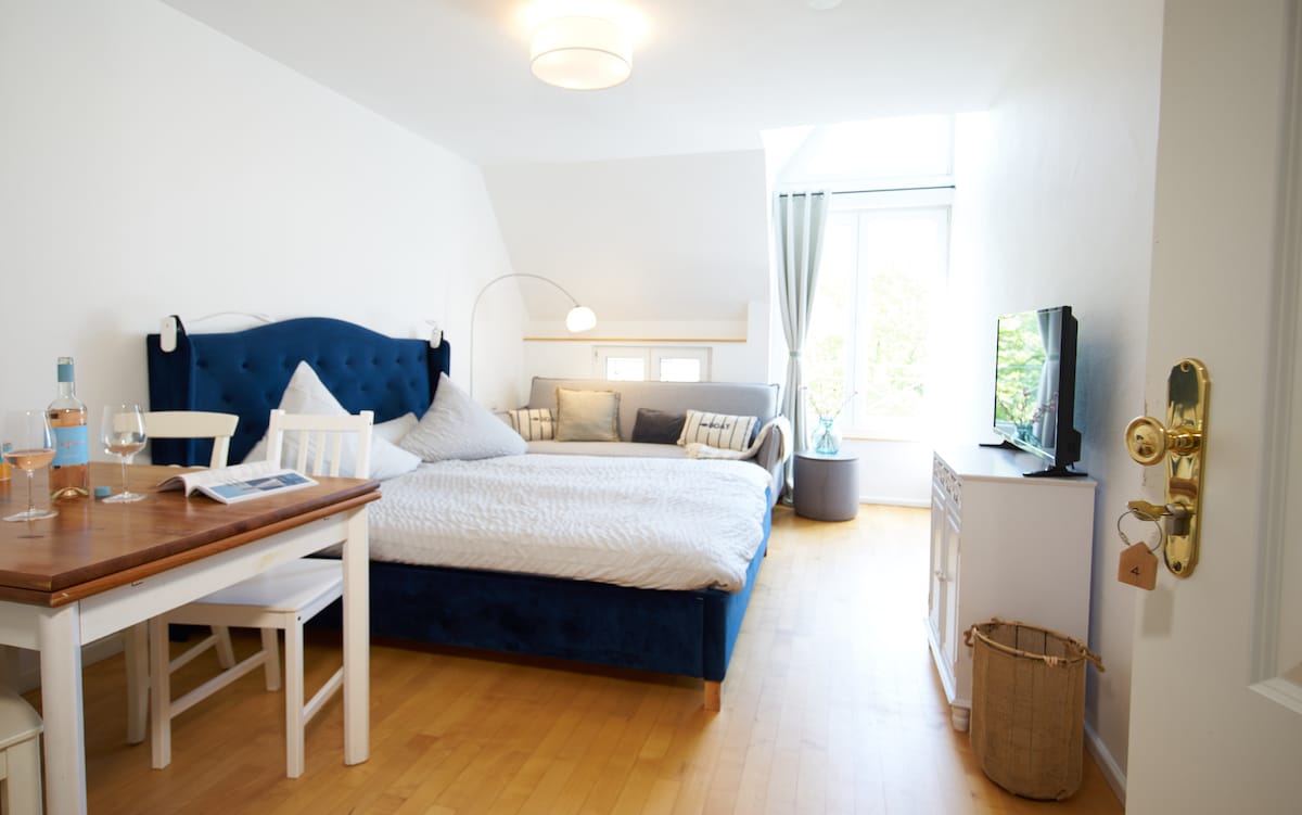 IN THE BLUE HOUSES - Apartments is a small charming old town house in Überlingen, just a few minutes from the Lake Constance. За нашими маленькими непримітними вхідними дверима в історичному "селі Уберлінгер" ховається похилий сундук зі скарбами. У будинку колишнього виноградаря XVI століття з пісковиком, половцями та балками даху ми вітаємо наших гостей приватними номерами (без сніданку). З нетерпінням чекаємо на Ваш візит, родина Бауманів.