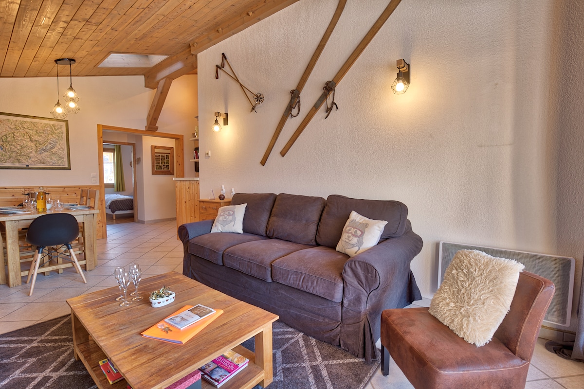 Цей просторий лофт площею 62 м² розташований в усамітненому шале без прямих сусідів і має власну приватну терасу площею 16 м². З кожного кута квартири відкривається захоплюючий вид на гори Аравіс і Ла Турнетт, що запрошує вас зупинитися і поміркувати. Насолоджуйтеся незалежним доступом через зовнішні кам’яні сходи та зручним приватним паркуванням безпосередньо за шале.