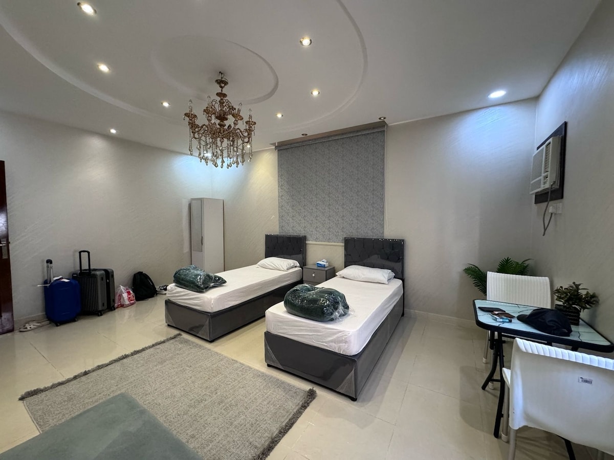 Вам сподобається вся увага до деталей у цьому стильному помешканні. Дуже маленька кімната, площа якої разом з ванною кімнатою не перевищує 10 метрів. Підходить для сну та відпочинку. Високий рівень приватності та спокою. Двері кімнати виходять прямо на вулицю. Вона має 1 диван-ліжко, тобто ліжко стає диваном і навпаки. Кільцева дорога від кімнати 500 метрів.. Мечеть Пророка знаходиться приблизно в 8 кілометрах. Може збільшитися до 10 км у години пік. Мечеть Кубаа приблизно 4 км. Продовольчі магазини та ресторани знаходяться на сусідній вулиці, приблизно в 500 метрах. Якщо ваше бронювання на 5 днів і більше, попросіть подарунок при виїзді.