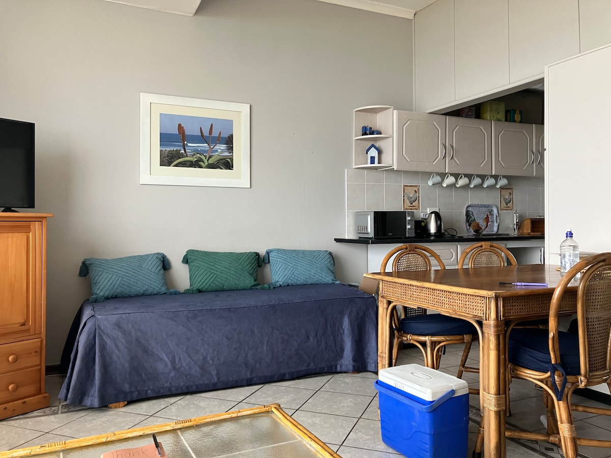 Немає LOADSHEDDING!! Розкішна приватна студія для відпочинку в моєму приватному будинку для відпочинку в моєму приватному будинку для відпочинку. Студія OpenPlan Selfcatering, розташована на пагорбі, має дивовижний вид на море/велика ванна кімната відкритого плану,подвійний душ/раковини,ванна,закритий туалет/раковина. Балкон/вид на 210 метрів пішки до пляжу! Немає повноцінної кухні, але є міні-кухня/кав 'ярня з мікрохвильовою піччю,чайником,тостером,міні-холодильником та всією посудом/столовими приборами. Лише 1 парковка. Netflix, Dstv. Системи резервного копіювання сонячної енергії та водопостачання.