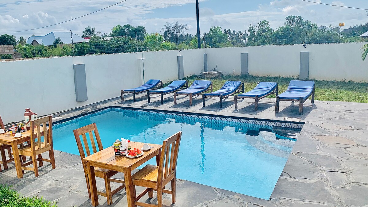Гостьовий дім з окремою ванною кімнатою, кухнею та зоною відпочинку на вулиці. Великий сад і спільний басейн (лише зі мною та моєю сім 'єю). Доступний Wi-Fi (20 Мбіт/с). Прибирання кімнати проводиться раз на тиждень для триваліших бронювань. За необхідності можна безкоштовно користуватися пральною машиною. Він знаходиться в 20-25 хвилинах ходьби від пляжу Нунгві або Кендва або в 5 хвилинах їзди на автомобілі або тук-туку. За необхідності ми допоможемо вам організувати транспорт 😊