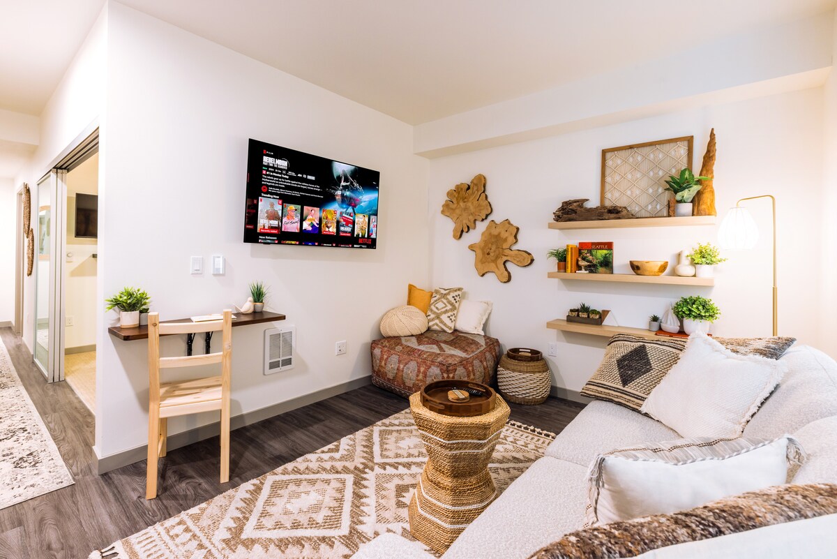 Зручне розташування в 5 хвилинах від стадіону t-mobile park і поля Lumen. Чемпіонат світу з футболу, Всесвітня серія. Розташування на заході Сіетла в районі північного адмірала, з дивовижним видом на горизонт Сіетла, окремим апартаментами з однією спальнею, каміном і додатковим ліжком і дивовижним видом на місто, розкішним спа-душним душем, 11 хвилин до Пайк-Плейс, 2 хвилини ходьби до культового парку Сіетла, kuerig та еспресо-машиною, повноцінною сучасною кухнею, мікрохвильовою піччю, холодильником, постільною білизною преміум-класу та ліжком King size із пам 'яттю, прямим телебаченням,