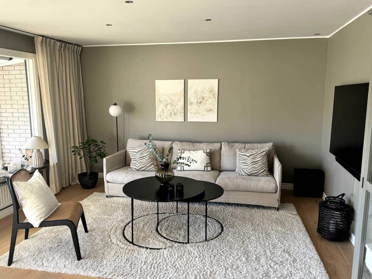 Сучасний двоквартирний будинок площею 130 квадратних метрів на 2 поверхах з власним садом недалеко від міста. Палуби у всіх напрямках, поруч із громадським ігровим майданчиком з дитячим майданчиком і дуже близько до природних заповідників з електричними світловими доріжками, доріжками для гірських велосипедів та відкритими тренажерними залами. 150 метрів до автобусної зупинки, яка доставить вас до центру Сандбіберга або метро до центру Стокгольма. 100 метрів до найближчих ресторанів, кафе та місцевого життя. 5 км до Westfield (Mall of Scandinavia), найбільшого торгового центру в скандинавському регіоні та близько 1 км до великих продуктових магазинів.
