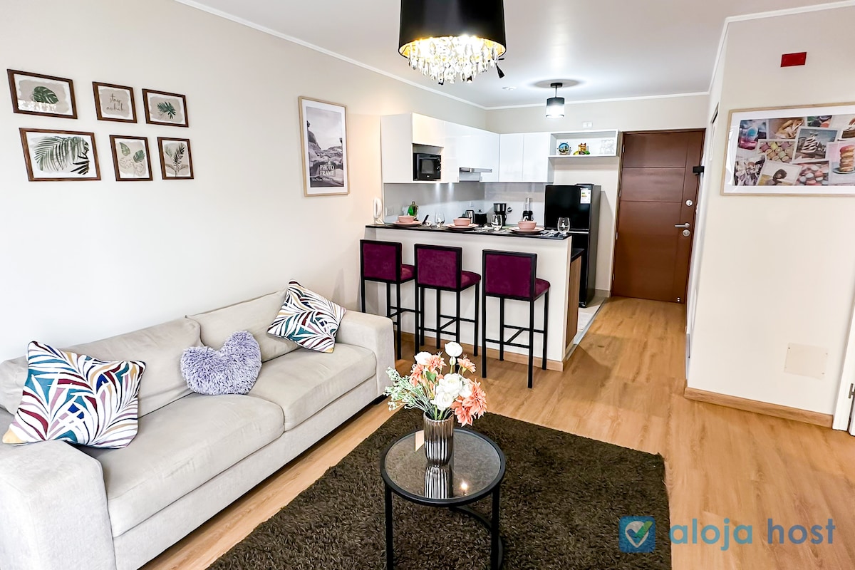 " Departamento estratégicamente ubicado en el exclusivo distrito de San Isidro, completamente equipado para dos personas e ideal para viajes de negocios, parejas y viajeros solos" "El departamento cuenta con una decoración moderna y atemporal, destacando su confort y buen gusto"