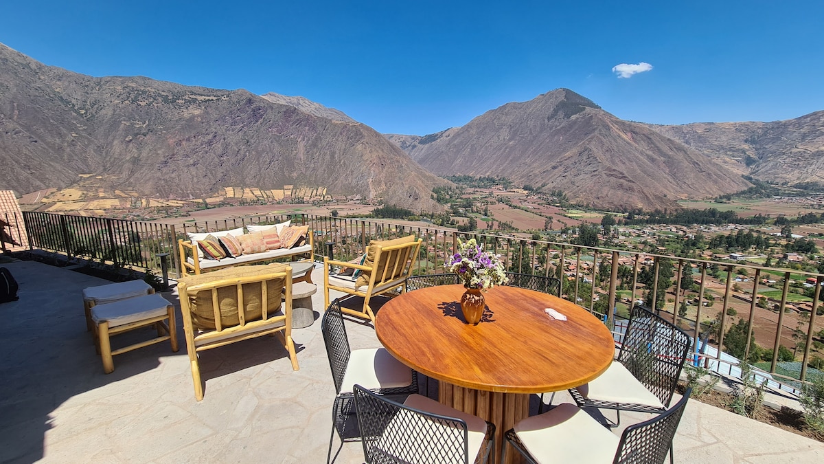 Disfruta de esta exclusiva villa ubicada en la ladera de un Apu (cerro), con una de las vistas más espectaculares del Valle Sagrado de los Incas. A 1 y 1/2 hora de Cusco y 1/2 hora de la estación Ollantaytambo - Machu Picchu. Contamos con capacidad de hasta 12 personas, 4 recámaras, 4.5 baños, y una amplia terraza para disfrutar con amigos o familiares. La casa cuenta también con chimenea, parrilla y fogatera externa; además de diversos ambientes llenos de detalles de amor, naturaleza y arte.