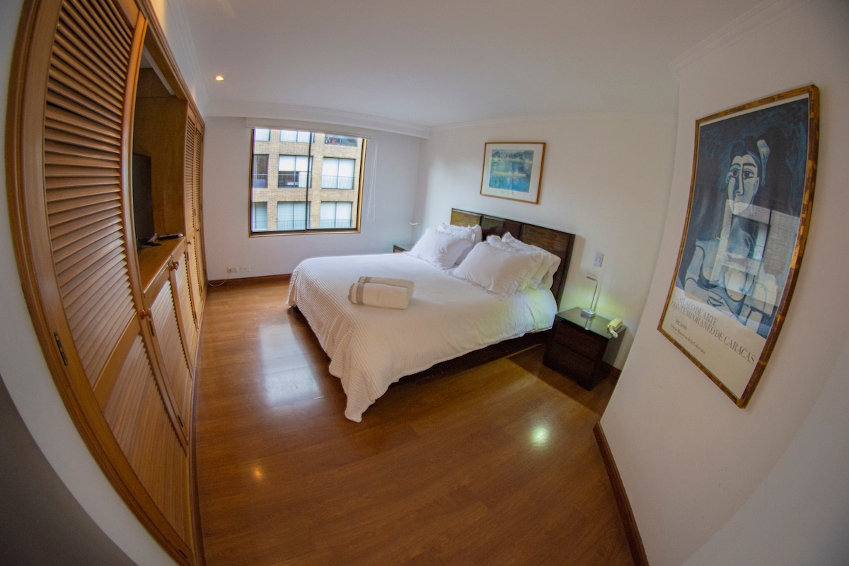 Розкішна одна спальня в найексклюзивнішому/ безпечному районі Боготи (Чіко) у пішій доступності від найкращих ресторанів, торгових центрів і в безпосередній близькості від багатьох підприємств. Проживання на вищому рівні з виділеним робочим місцем, приватною терасою, автоматичним каміном, надійним Wi-Fi, приватною парковкою та охороною будівлі. Зручності: насолоджуйтеся красивою панорамною терасою з каміном і відкритим грилем. Також грайте в сквош і відпочивайте в сауні або парній.