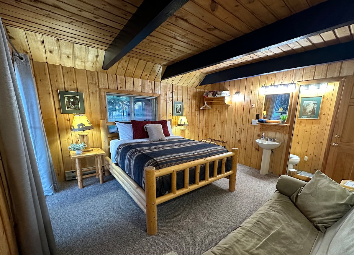 Private entry guest lodge. Community room by the office where a continental breakfast is provided, and is a shared living room for TV, Games, meeting friends, and more. Near Zion, Bryce, Kolob. Custom crafted log bed and matching dresser, large tub/shower. An inviting porch opens to mature trees, birds, wildlife. Enjoy the trails and gardens of this popular event venue. Call to reserve at the Roadhouse BBQ- best brisket and prime rib in town.