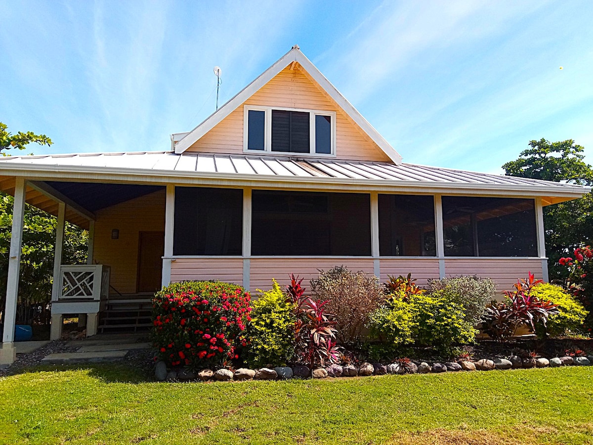 Our wonderful house is located in a quiet and safe area of Utila. On our open lush property, we grow a variety of fruits. You can enjoy the tranquility and view from the hammock on the elevated balcony. The public beach, town center, dive shops, gym and groceries stores are within walking distance. The house has 2 airy bedrooms, an open fully equipped kitchen and living room plus private bathroom. Come and enjoy this tropical Paradise.