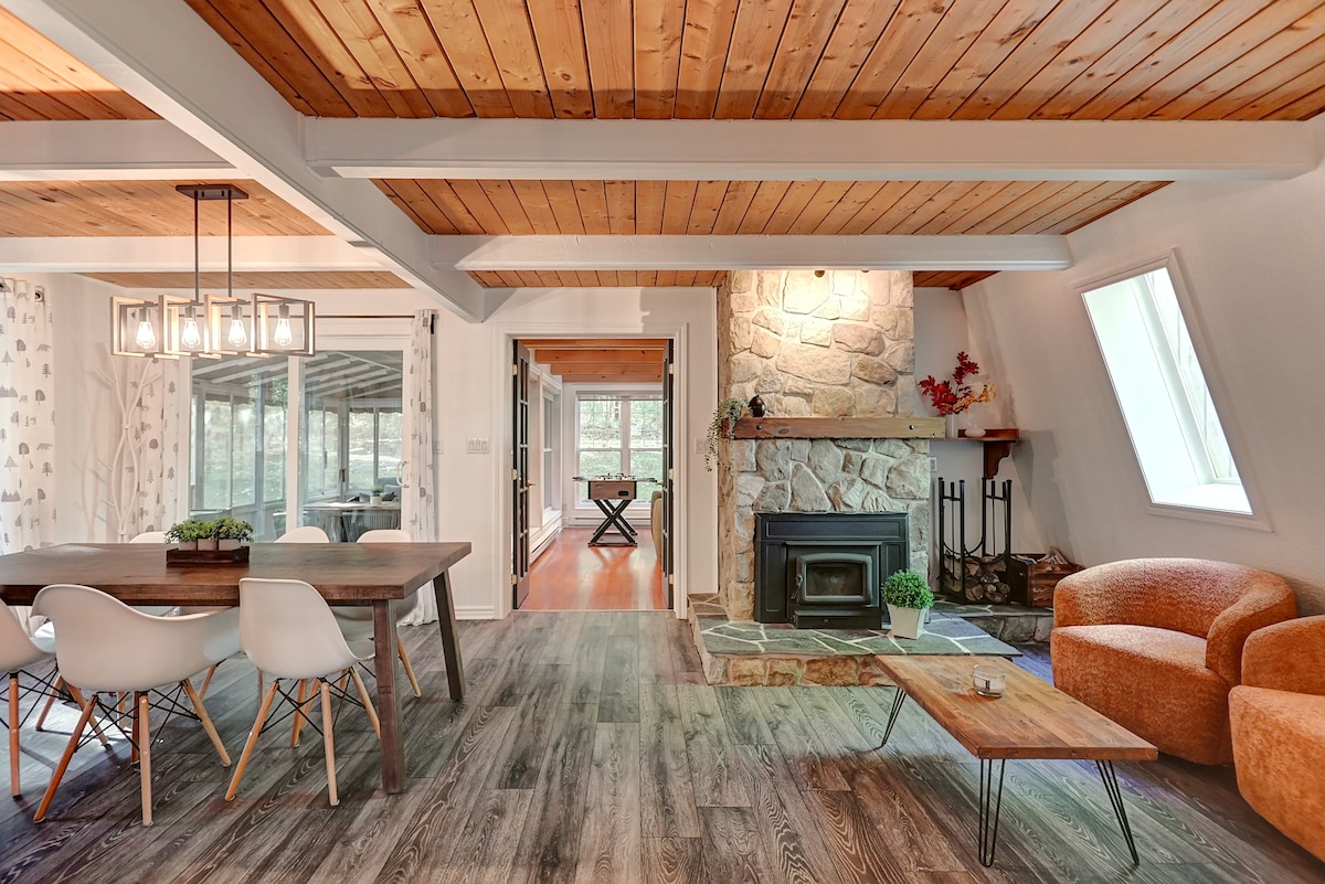 Красивий дерев 'яний заміський будинок із соборним дахом і дров' яною піччю, розташований безпосередньо на березі озера Десмарай в Естрі. Причал - ідеальне місце для відпочинку. Приватне озеро - це заповідна територія (без газових двигунів) щороку наповнюється фореллю та іншими видами риб. У вашому розпорядженні буде сапсерфінг, каное та байдарка. Гідромасажна ванна доступна для використання цілий рік. Починаючи з січня 2021 року : 1 бронювання = 1 дерево пересажено через Tree Canada