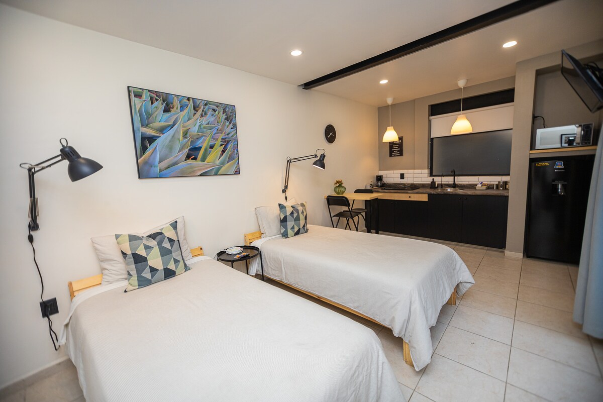 Затишна студія з окремим входом на 2 людини, кухнею, ванною кімнатою, залом для сніданку. Смарт-телевізор і високошвидкісний Wi-Fi. 15 хвилин від аеропорту. На затишній, затишній вулиці і легко дістатися автомобілем або громадським транспортом (4 квартали від метро «Балбуена»). Чудове розташування, ми знаходимося в 10 хвилинах від Palacio de lo Deportes, Autódromo Hermanos Rodríguez, Foro Sol, TAPO Bus Terminal. І 20 хвилин їзди до історичного центру.