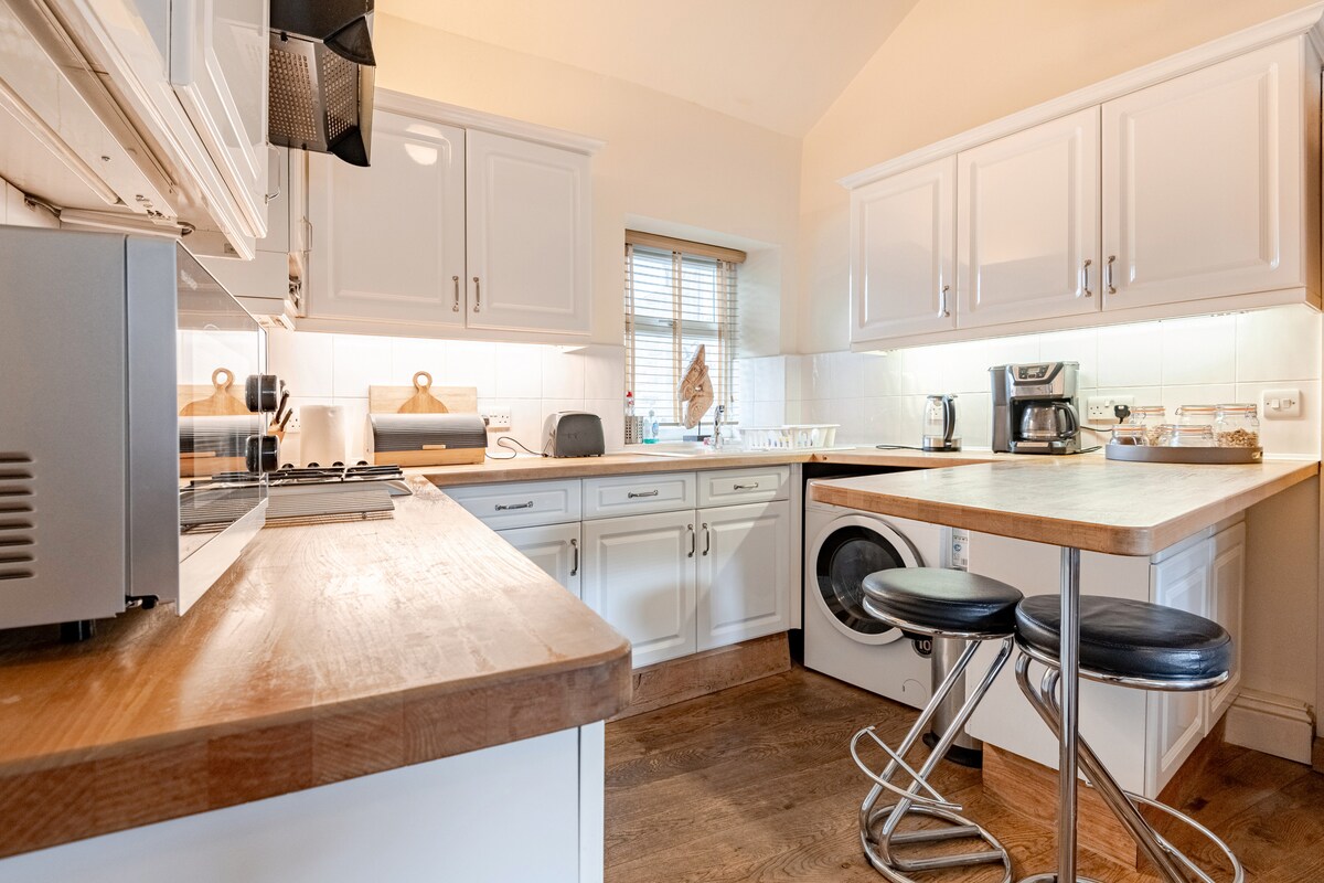 Знайдіть себе в серці Харрогейта у високоспецифічному схованці! У сучасних апартаментах є 2 спальні з ванною кімнатою, окремий вхід і паркінг поза вулицею. Всього 2 хвилини ходьби від магазинів і ресторанів, 5 хвилин від залізничного вокзалу і конференц-центру і 8 хвилин від красивих садів Долини. Повністю обладнаний пральною машиною/сушаркою, посудомийною машиною, мікрохвильовою піччю та смарт-телевізором. Підлогове опалення в двох ванних кімнатах. З нетерпінням чекатимемо на теплий йоркширський прийом!