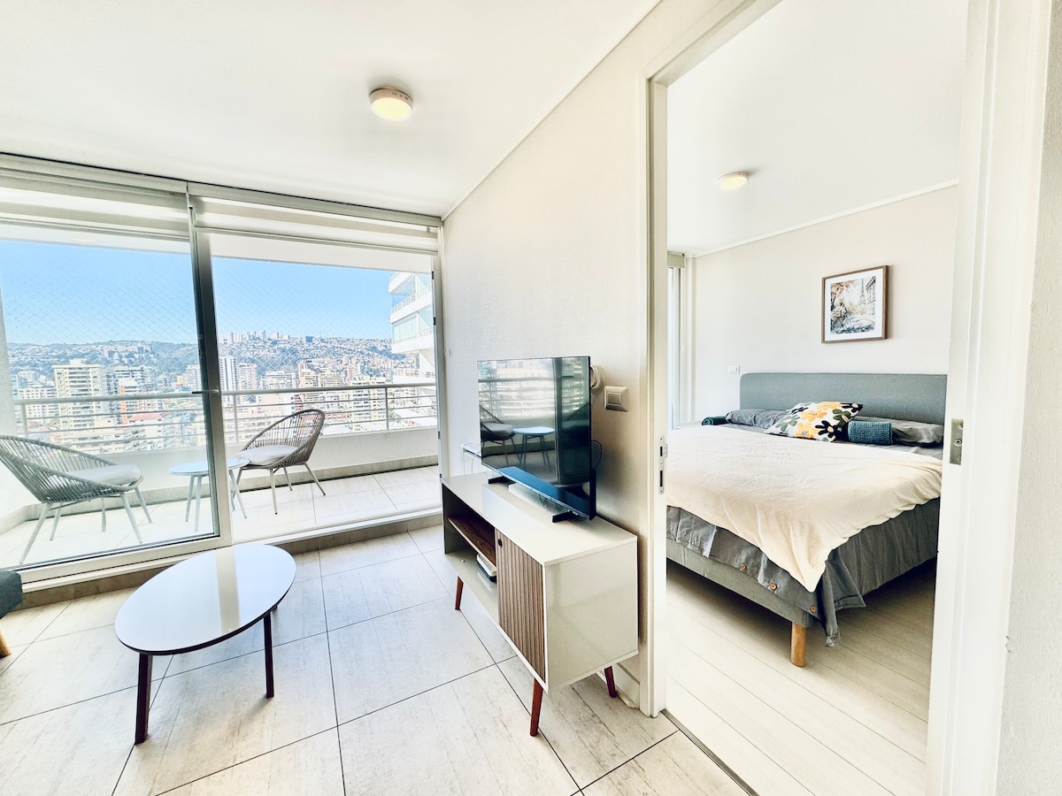 ¡Espacio relajante y elegante con terraza excepcional! Disfruta del invierno sin frío y vistas impresionantes. Cerca de hermosas playas y a minutos de las dunas de Concón. Ingreso independiente a través de cerradura inteligente. Comodidades de TV e internet. Edificio con coworking panorámico y agradables espacios para tu máxima comodidad. Estacionamiento incluido. Ambiente tranquilo para descansar. ¡No pierdas esta oportunidad! Contáctanos para más información.