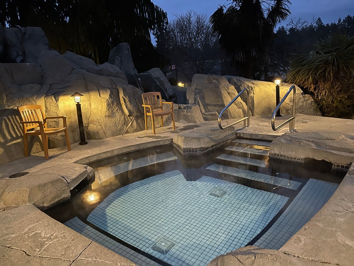 Ласкаво просимо до The INN-let: Suite A – частини комплексу Pacific Shores Resort & Spa. Цей кондомініум на березі океану з 1 спальнею та 1 ванною кімнатою пропонує спокійне оточення та НЕПЕРЕВЕРШЕНІ зручності: критий басейн/гідромасажна ванна/сауна, відкрита гідромасажна ванна/дитячий басейн, газові вогнища, піклбол та багато іншого! <10 хв від пляжу Раттревор/Парксвілл та <30 хв від порому Нанаймо/Затока відправлення. Помешкання на першому поверсі включає повну кухню, криту терасу, ліжко розміру King size та диван-ліжко розміру Queen size, ванну з окремим душем та пральню для вашого дому далеко від дому!