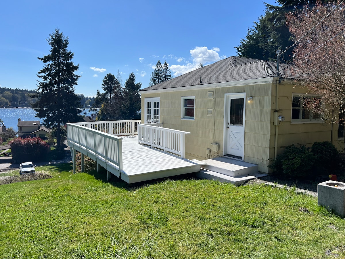 Яскравий затишний котедж-студія на північному кінці Вашона. П 'юджет-Саунд, гора Бейкер і краєвиди на природу. Нещодавно відремонтована на всій території з великою терасою, щоб насолодитися відкритим вогнищем і видом на воду. Тихий район в 10-15 хвилинах ходьби від порома (зверніть увагу, що є схил, оскільки ми знаходимося на пагорбі вище). Олені, яструби, орли та багато іншого оточують помешкання. Приходьте насолодитися місцевою перлиною та насолодитися маленьким острівним життям, всього в 20 хвилинах їзди на поромі від Сіетла!