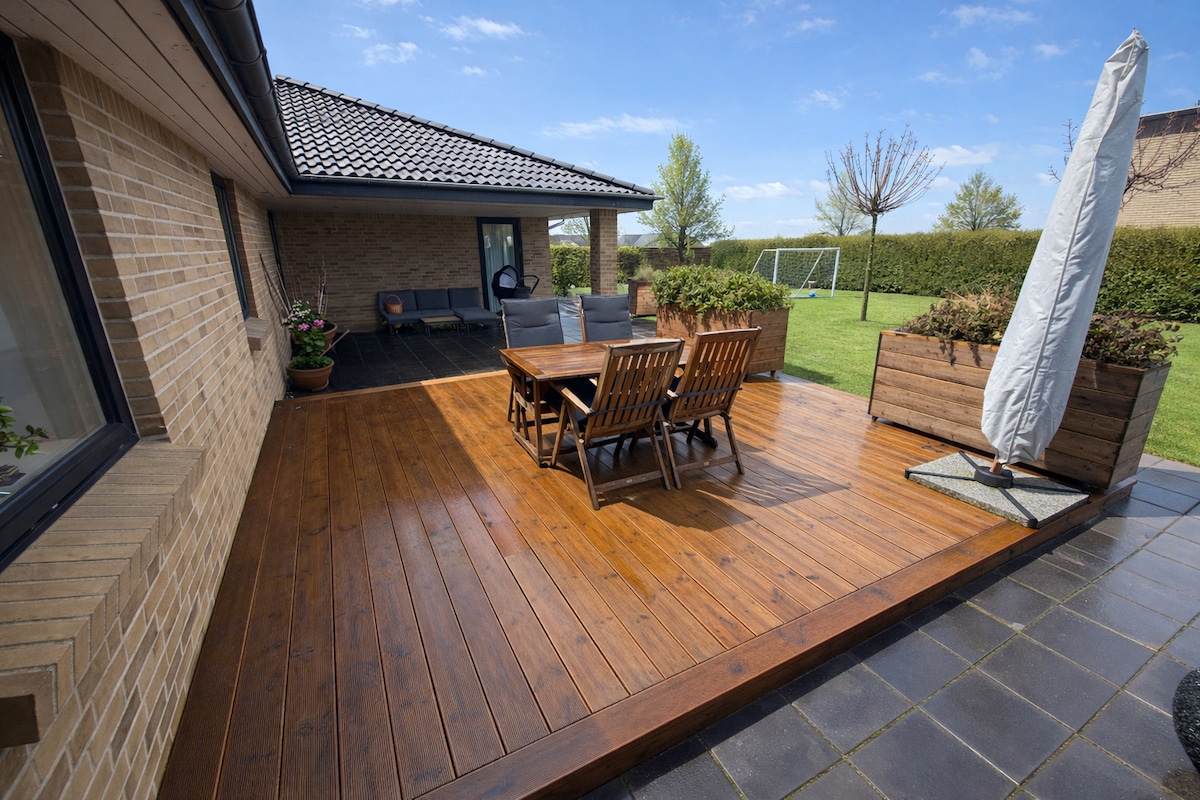 Великий нещодавно відремонтований будинок для відпочинку в мальовничій місцевості поблизу основних визначних пам’яток і атракціонів. Будинок добре обладнаний і розташований на великій ділянці землі поблизу лісів і природних стежок для піших прогулянок і бігу. Інтер’єр світлий і затишний, з багатьма розвагами для дітей і дорослих. До найбільших визначних місць регіону можна швидко дістатися на автомобілі: - Леголенд, Лаландія, парк Wow, Legohouse, 15 хвилин - Аеропорт, 20 хвилин Ми живемо за кілька кілометрів і бажаємо вам приємного перебування!