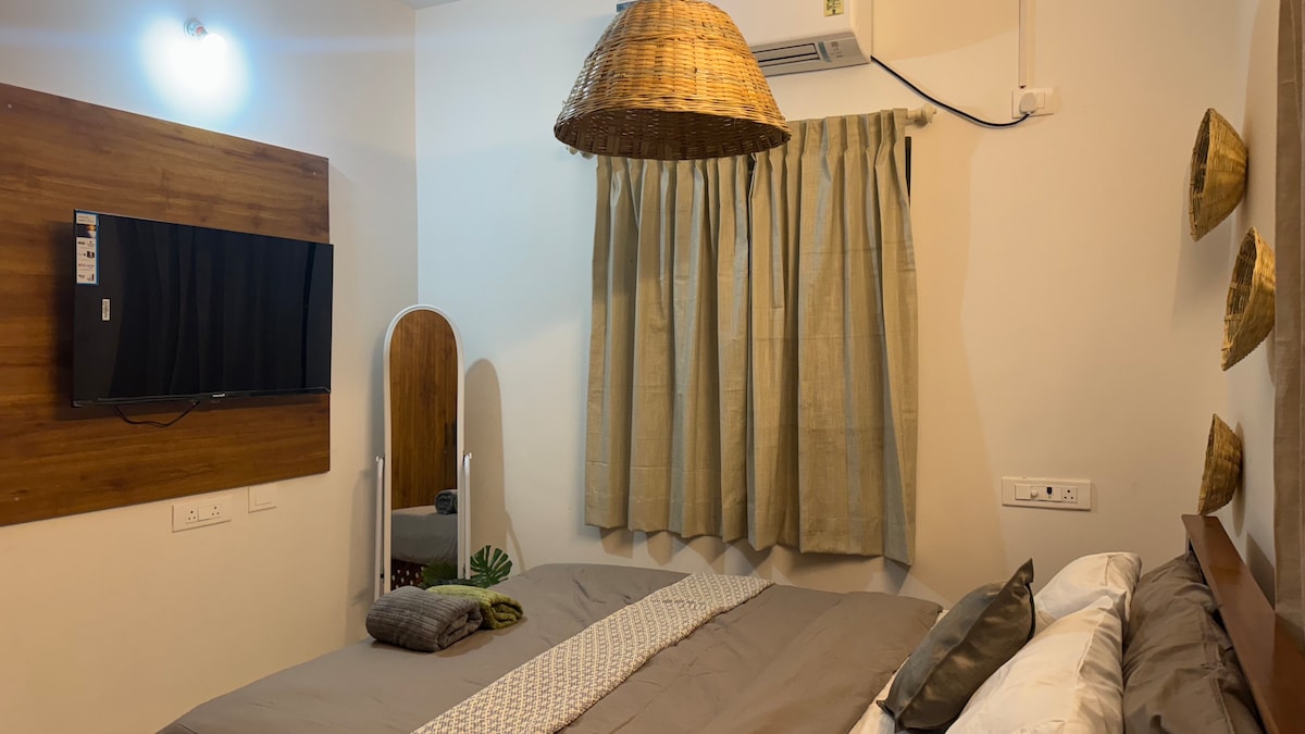 - 2 Bedrooms with wardrobes & attached bathrooms - A/C in living room & 2 bedrooms - High-speed WiFi & Smart TV - Gas Stove for Cooking - Modular Kitchen with induction stove, microwave, fridge, kettle & essentials - Relaxing wooden swing in the living room - Alternate-day cleaning - Washing Machine for your laundry needs - On-call driver service - 2 mins walk to Velachery 100 ft Road - 10 mins walk to Phoenix Market City - 10 mins walk to IIT Chennai (Velachery Gate) & Gurunanak College