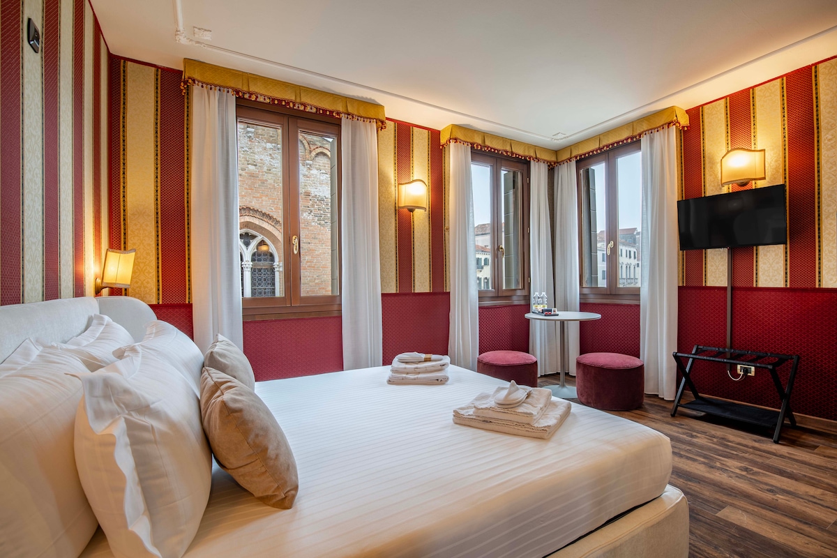 Елегантна двомісна або двомісна кімната з меблями в венеціанського стилю та тканими стінами дамаска, розташована в 2 хвилинах ходьби від площі Сан-Марко. Усі номери обладнані: кондиціонером, супутниковим телебаченням, безкоштовним Wi-Fi та окремою ванною кімнатою з туалетно-косметичними засобами. Крім того, у всіх кімнатах є штепсельний адаптер для універсальних розеток. Площа кімнати: від 12 до 14 кв. м