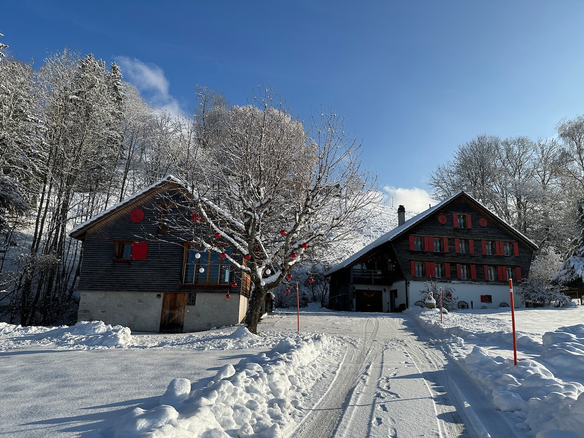 У центрі сільської місцевості квартира на першому поверсі, зі смаком перетворилася в 2019 році на старий столярний майстер-клас. Дуже яскравий, поруч зі старим відремонтованим фермерським будинком. Має терасу з видом на середні гори. Дуже тихо. Добре розташоване між Женевським озером і альпійськими передгір'ями. Поруч із пішохідними та культурними турами (Грюєр, Монтре, Веве, Лозанна та Берн). Тривалість оренди: мінімум 3 ночі.