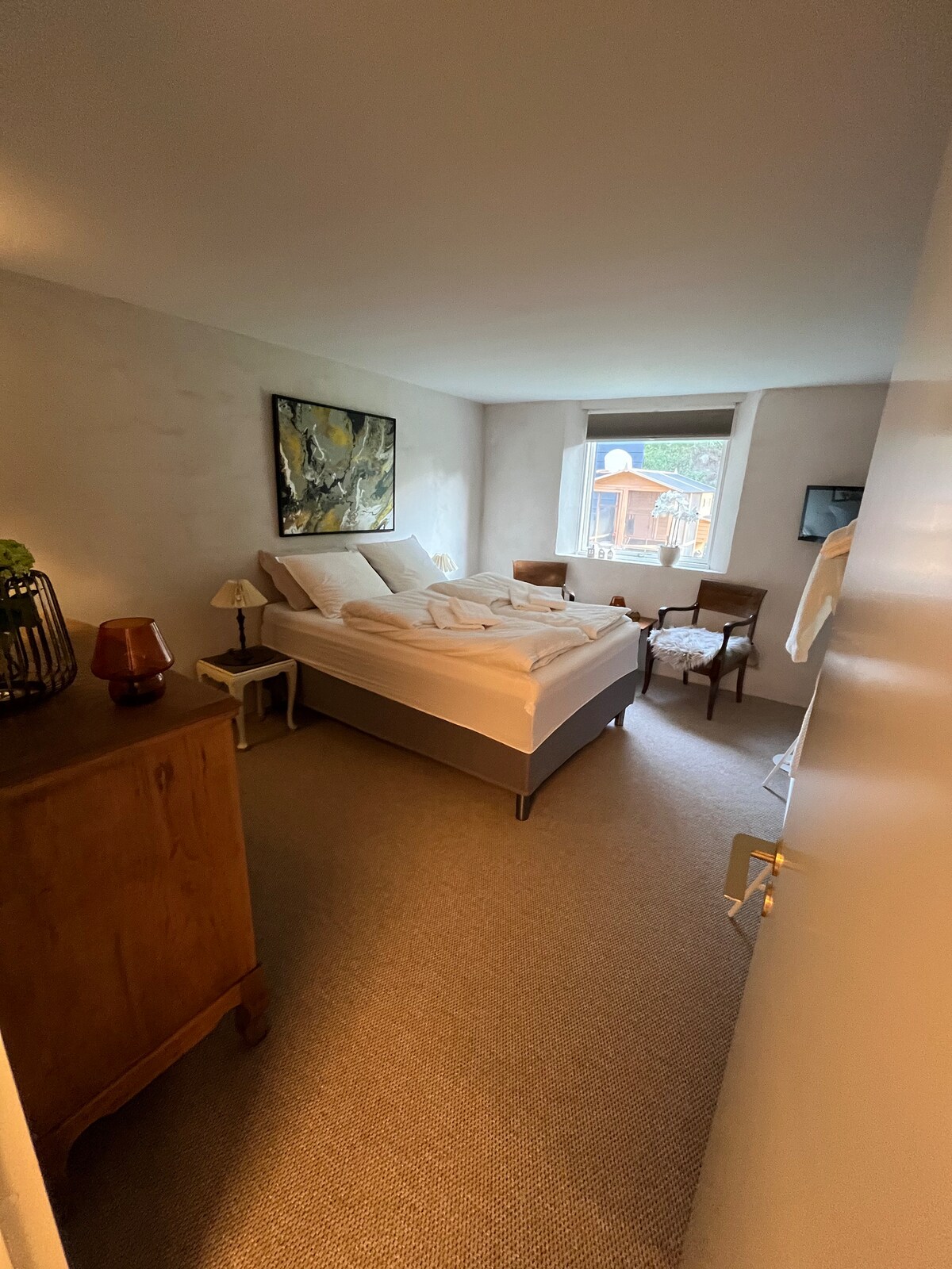 Будинок розташований у сільській місцевості з багатьма можливостями для відпочинку на природі. Паркування прямо біля дверей. "Aftægtshuset" - це житло площею 80м2, з яких 50м2 використовують гості AirB&b. 2 спальні з можливістю додаткового спального місця. Ванна кімната та міні-кухня з холодильником. Зверніть увагу, що плити немає. Спробуйте, наприклад, прогулянку по стежці Хіммерланд, риболовлю на прекрасній річці Сіместед, або відвідайте чудовий парк Розен і парк активного відпочинку. У цьому районі також є цікаві музеї.