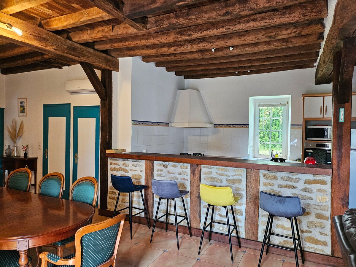 Сімейна ферма Berrichonne нещодавно відремонтована, щоб привітати вас на кордонах Буашо, долини Креуз, регіонального природного парку Бренн або країни Джорджа Сенда. 5 спалень з індивідуальними ванними кімнатами, включаючи одну, обладнану для людей з обмеженими можливостями. Велика вітальня облаштована навколо великого столу та дерев 'яної печі. Не підходить для будь-яких святкових і шумних зібрань через спільне громадянство і розташування в селі, де переважає спокій