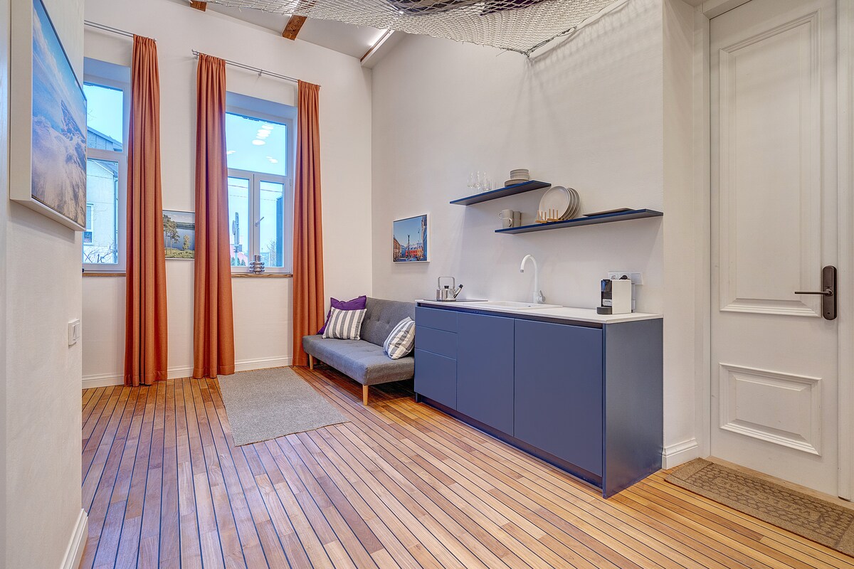 Cozy Maritime-Inspired Studio in Vilnius—Free Parking, Netflix, and Charm Welcome to your charming maritime-inspired studio—a unique retreat in a beautifully restored 1909 home. This cozy space, ideal for couples, small families, or solo adventurers, it combines vintage charm with modern-day comforts. Located near Vilnius’ largest green space, Vingis Park, and a short walk to the heart of the UNESCO-listed Vilnius Old Town, it’s the ideal base to explore the city.