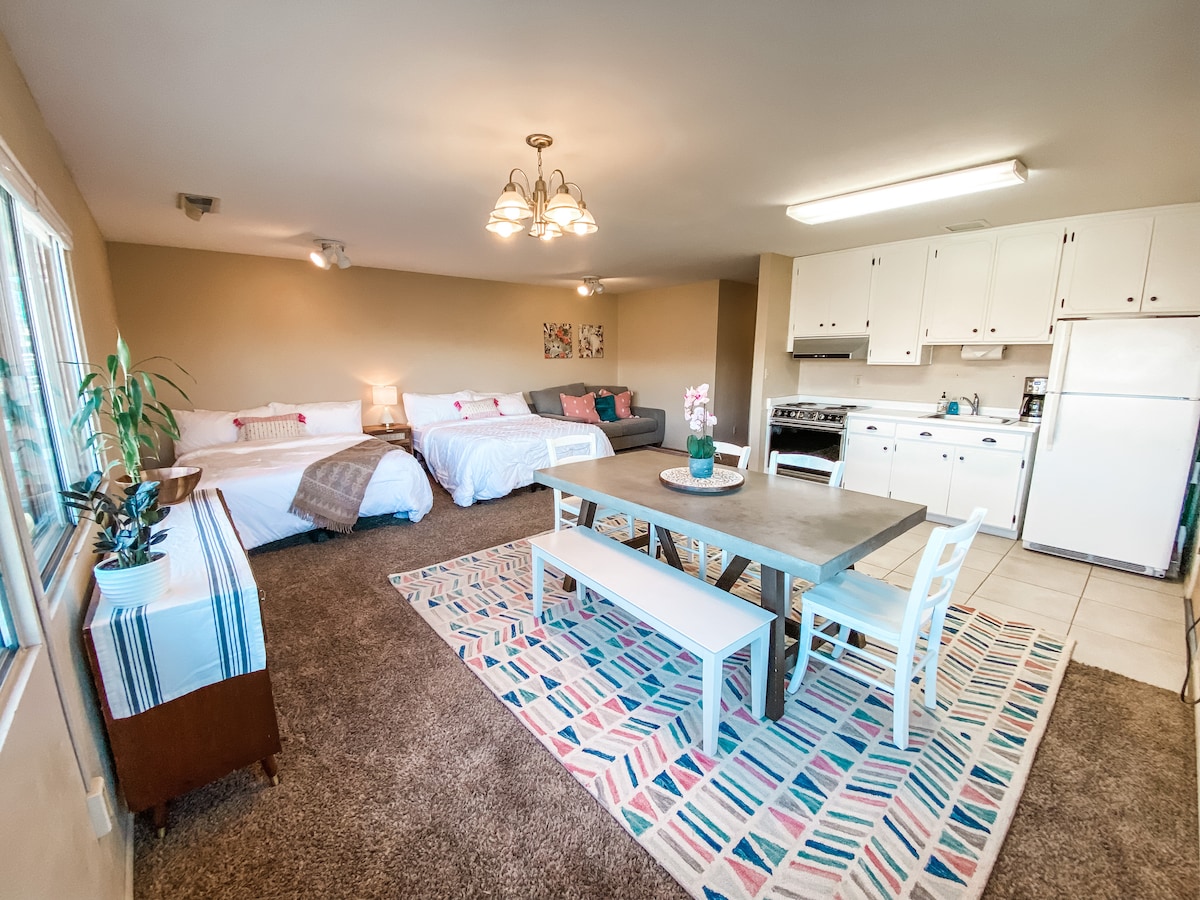 Vermilion Oasis розташований у Ранчо-Канабі й оточений скелями Верміліон. Касита — це окрема будівля з парковкою та окремим входом. У помешканні є простора спальня та вітальня з кухнею, ванною кімнатою та пральною машиною/сушаркою. Це помешкання ідеально підходить для 2 осіб і може вмістити 4 осіб. Задній двір огороджений і підходить для собак. Ви знайдете барбекю та місце для багаття, щоб відпочити та насолодитися краєвидами. Переглядайте улюблені потокові шоу завдяки високошвидкісному Wi-Fi і Roku.