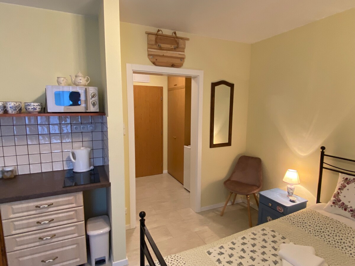 Стильні будинки з дерева та каменю. Студійна квартира у стилі дачного котеджу площею 50 м ² не залежить від будинку, має камін, багато обладнану кухню, велику оглядову терасу, спальню та ванну кімнату, ігрову зону для дітей. У вашому розпорядженні є приватний сад і зона для барбекю. Квартира призначена для тих, хто хоче втекти від повсякденного життя,зупинитися та відпочити у затишному місці, поруч з феноменально виглядаючим каміном зі склянкою вина в руці.