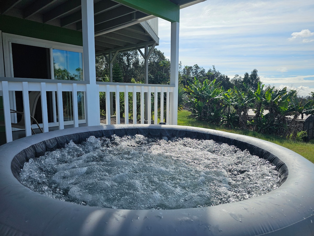 Цей тихий гірський притулок пропонує спокій і спокій у сільській місцевості поблизу Національного парку вулканів Гаваїв. У цьому приватному помешканні є криті приватні веранди з місцями для їжі, відпочинку та місцем для багаття. Інтер’єри мають унікальну гавайську атмосферу з вишуканим декором. Панорамні вікна на задній стороні хале відкривають безперешкодний вид на тропічний ліс. Повністю обладнана кухня – ідеальне місце для приготування сімейних страв.