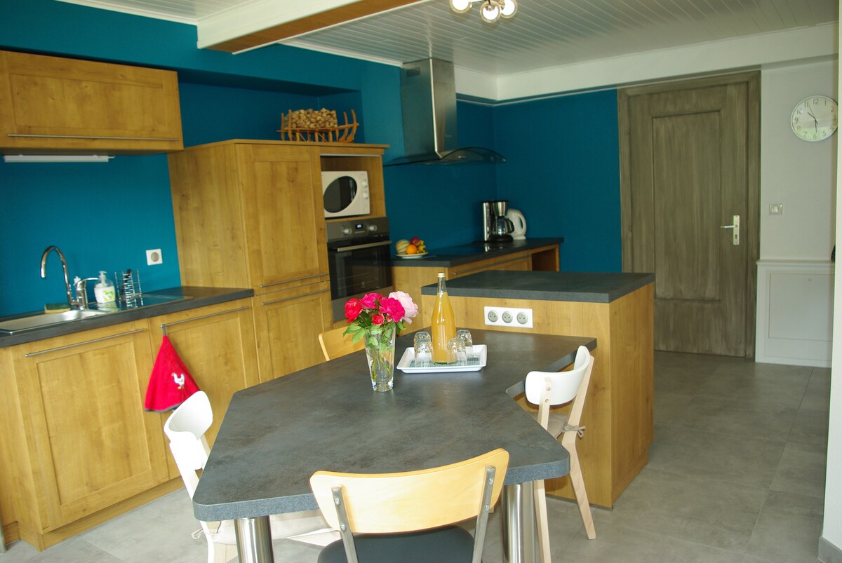 Розташована на першому поверсі будинку власника, вона знаходиться за 2 км від села. Незалежний вхід із задньої частини будинку. Обладнана кухня з індукційною плитою, духовкою, холодильником, мікрохвильовою піччю, посудомийною машиною, кавомашиною з фільтром та Senseo, чайником, тостером, спальня з 1 двоспальним ліжком, спальня з 1 двоспальним диваном-ліжком, вітальня, ванна кімната (ванна та душ), відкрита зона. Ліжка, застелені після прибуття, і надаються рушники. Наявне дитяче обладнання.