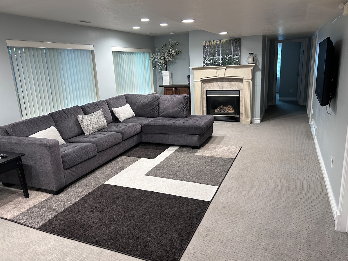 Красива підвальна квартира в тихому районі з окремим входом. Сводчасті стелі у вітальні та на кухні з кварцовими стільницями. Підлога з твердих порід дерева з акцентними килимами. Дуже чистий і просторий підвал із двома спальнями, двома ліжками queen-size та повноцінною ванною кімнатою. 20 хвилин їзди до кампуса BYU, 25 хвилин до UVU, одна година до SLC. Поруч із пішохідними маршрутами. Кількість місць: до чотирьох осіб. Добре піддається санобробці після кожного перебування. Доступ до внутрішнього дворика з альтанкою та грилем.