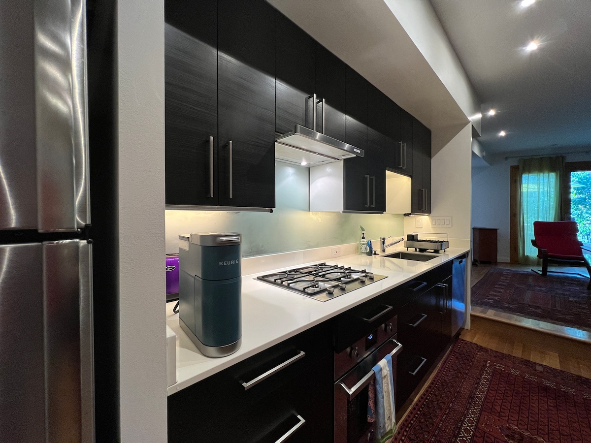 Цей сучасний англійський підвальний будинок площею 1000 квадратних футів розташований усього за кілька кварталів від вулиці М-стріт і Вісконсін-авеню. У вашому розпорядженні буде весь нижній поверх нового будинку в Джорджтауні, а також приватний внутрішній дворик із видом на прекрасний сад. Функції розумного помешкання охоплюють голосові команди для освітлення, опалення та охолодження, стельовий вентилятор, дверний замок тощо. Для роботи є два окремі робочі місця та швидкий надійний Інтернет. Для відпочинку ми пропонуємо повний пакет кабельного телебачення та стримінгових сервісів.