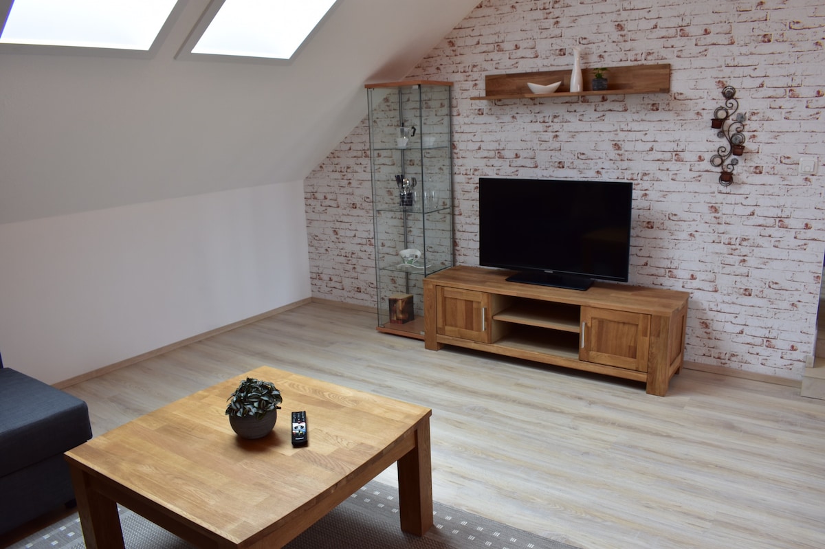 Наша затишна двоповерхова квартира площею 38 м² пропонує середземноморський шарм на двох поверхах – з власною терасою та окремим входом. Світла вітальня та їдальня на першому поверсі запрошують вас затриматися, а романтична спальня на мансарді з низькою стелею створює особливу атмосферу. Крім того, також можна спати на першому поверсі. Невелика ванна кімната з ванною доповнює пропозицію. Ідеально підходить для пар або одиночних мандрівників, які шукають спокою та природи.