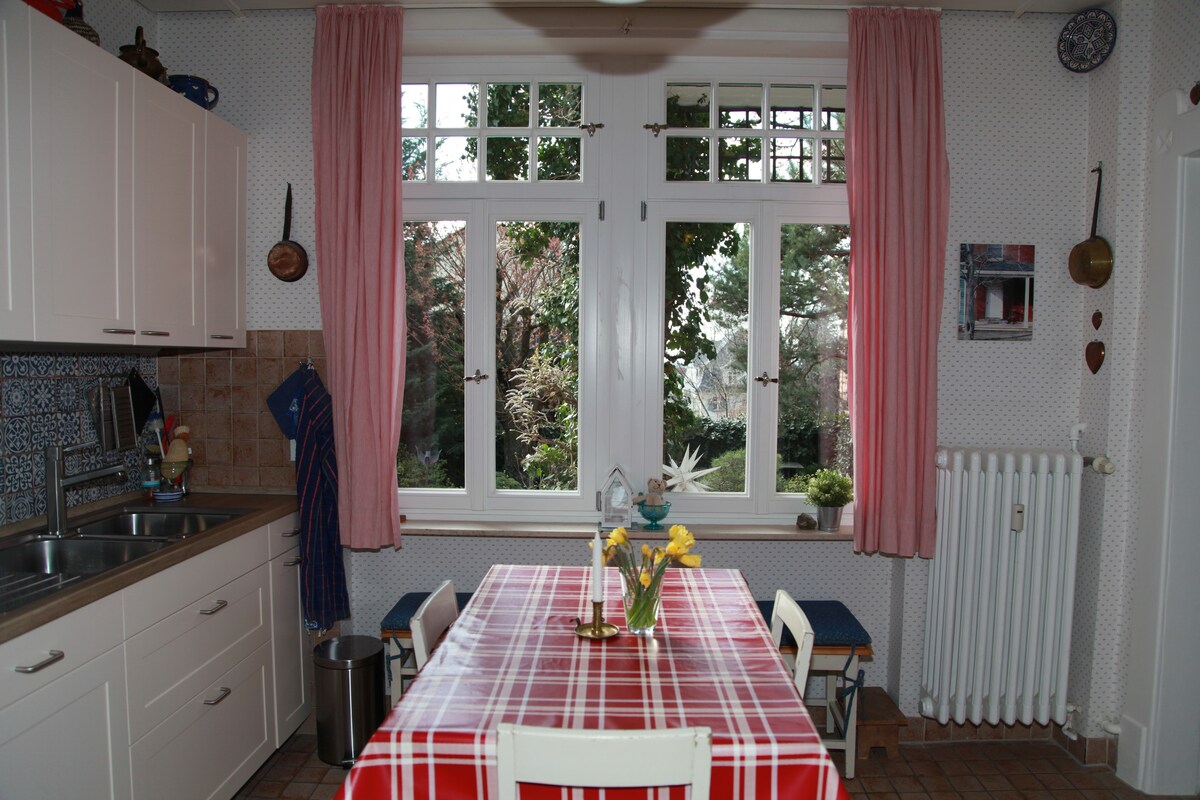 Наш будинок розташований на пагорбі в справжньому тихому житловому районі. У модернізованій квартирі для некурящих є дві спальні з ліжками розміром «king-size», вітальня з двоспальним ліжком, повністю переобладнана ванна кімната та нова кухня-вітальня. Нашим гостям пропонується скористатися великим садом - садовими меблями, зонтиком і Weber-Grill. Ми забронювали місце для паркування безпосередньо перед нашим будинком, особливо для наших гостей.