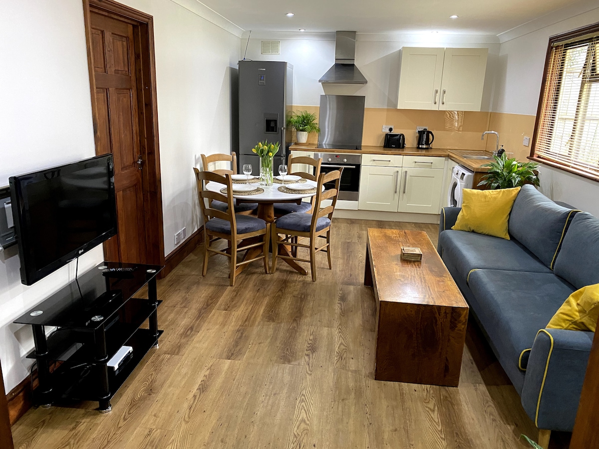 Квартира розташована на відстані прогулянки від вулиці Ешер Хай Стріт, через подвір 'я Клайв-хаусу, грузинського житла, побудованого в середині вісімнадцятого століття Клайвом Індії. Нещодавно відремонтоване помешкання включає : вітальню, кухню/їдальню та спальню з двоспальною кімнатою та власною ванною кімнатою з двоспальним ліжком розміру «king-size» Житло включає нову компактну та повністю обладнану кухню, обідню зону з дров 'яною піччю, розкішний диван та звукову панель Smart HD TV/ Sonos, а також безкоштовний Wi-Fi.