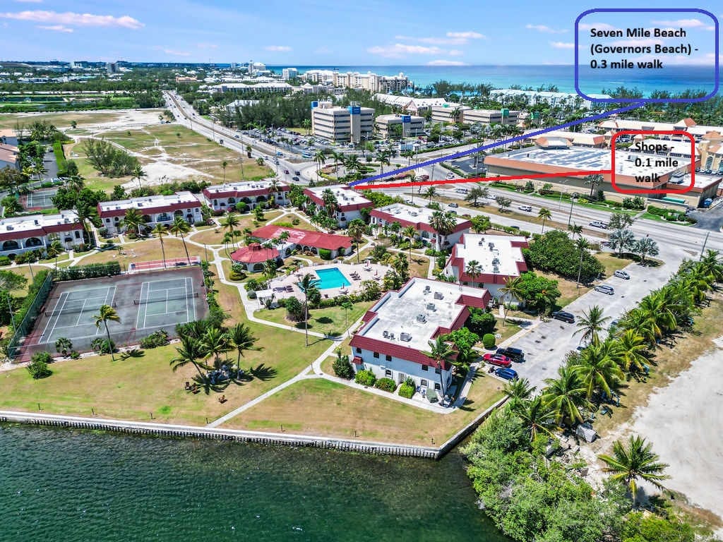 Modern Renovated Second-Floor 3BR/2BA | Seven Mile Beach Corridor Experience luxury living just a 3–5 minute walk to Seven Mile Beach, with top-tier dining, shopping, and nightlife all within easy walking distance. This beautifully renovated second-floor residence is set within lush, landscaped grounds featuring expansive green spaces and a stunning pool overlooking Mitchells Creek. Enjoy serene water views from the living room, TV room, private patio, and primary bedroom—perfect for relaxing