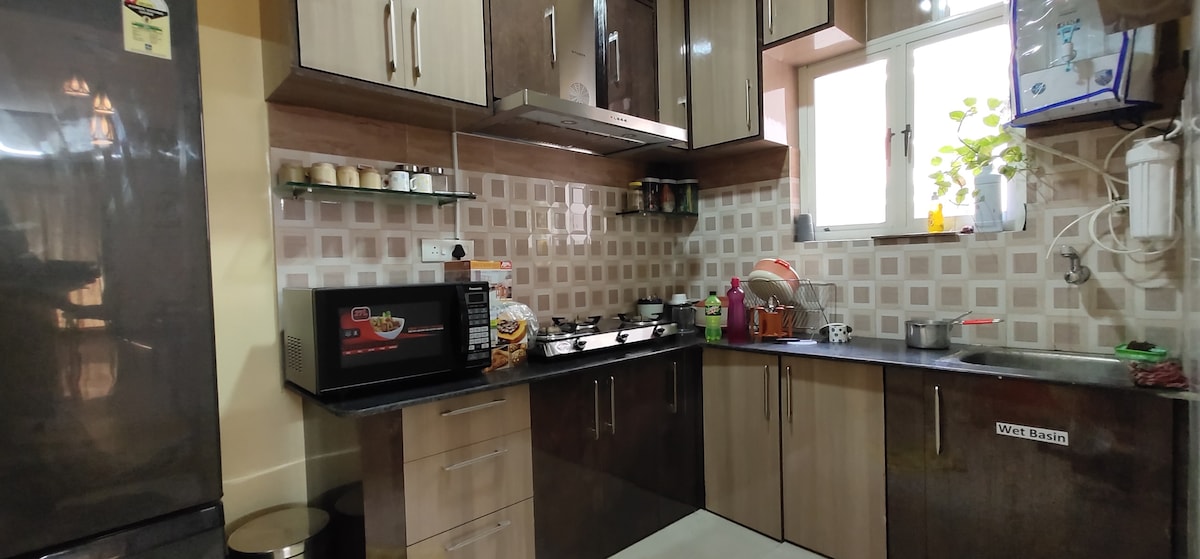 Затишна пентхаус-студія для пар біля метро Нетаджі Гостюйте в цій просторій, добре освітленій пентхаусі на 3-му поверсі резиденції Аннапурна, всього в 4 хвилинах ходьби від метро Нетаджі, ринку та транспортних вузлів. Ідеально підходить для роботи або відпочинку. У ньому є проектор розміром 6x4 футів, робочі місця, масажер для ніг, масажер для тіла, спа-салон для ніг і все необхідне для фітнесу, як-от килимок для йоги, ваги та підтяжка. Спокійний відпочинок з усіма сучасними зручностями.