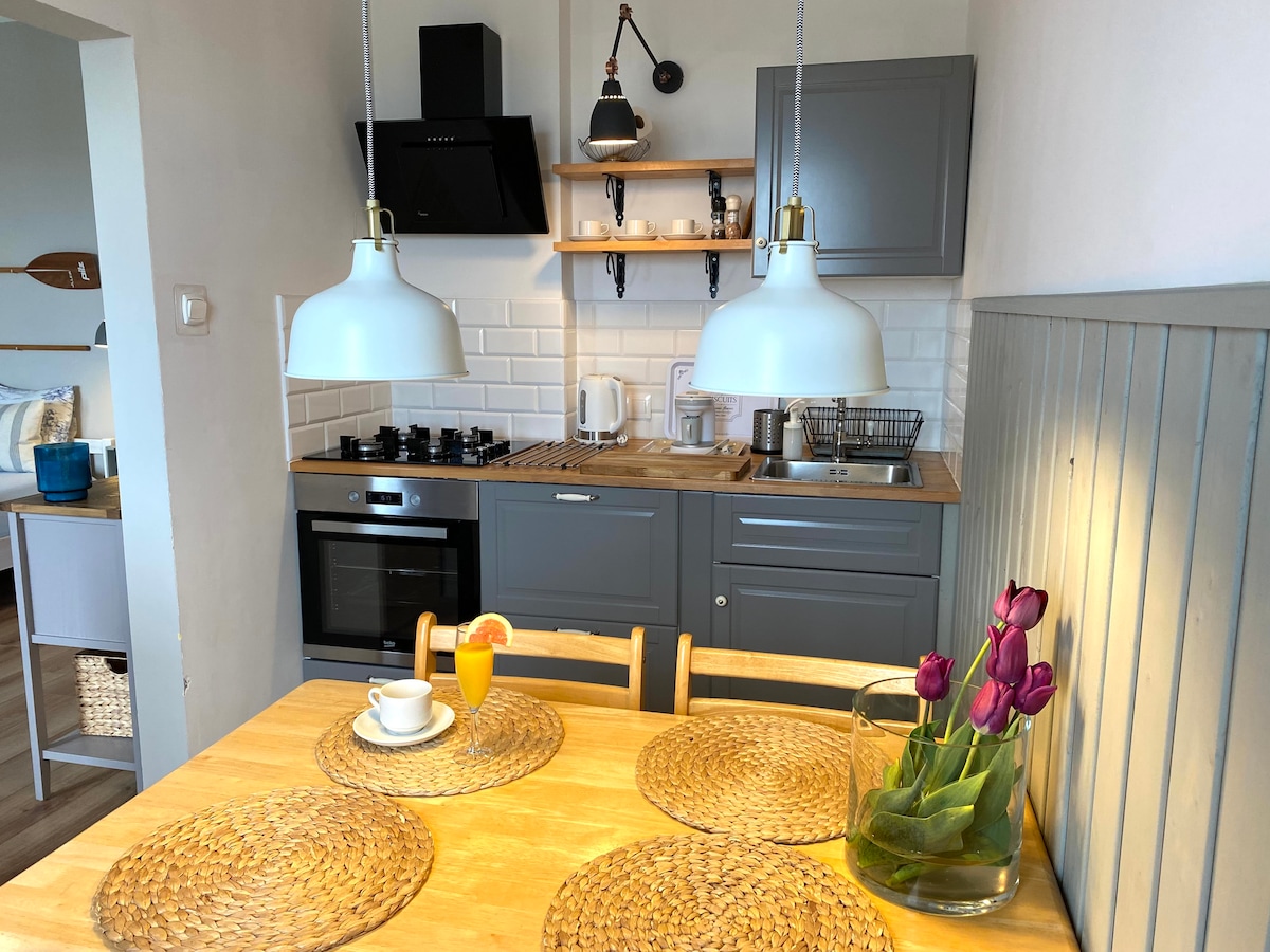 Квартира-студія розташована поруч з спа-парком, що веде до приморської набережної. Поруч із бульваром на річці Свині та поромною переправою. Поруч знаходиться центр міста з магазинами, кафе та ресторанами. Є кухня з мікрохвильовою піччю, холодильником і плитою. Постільна білизна та рушники надаються. Гості можуть користуватися підземним паркінгом за додаткову плату.